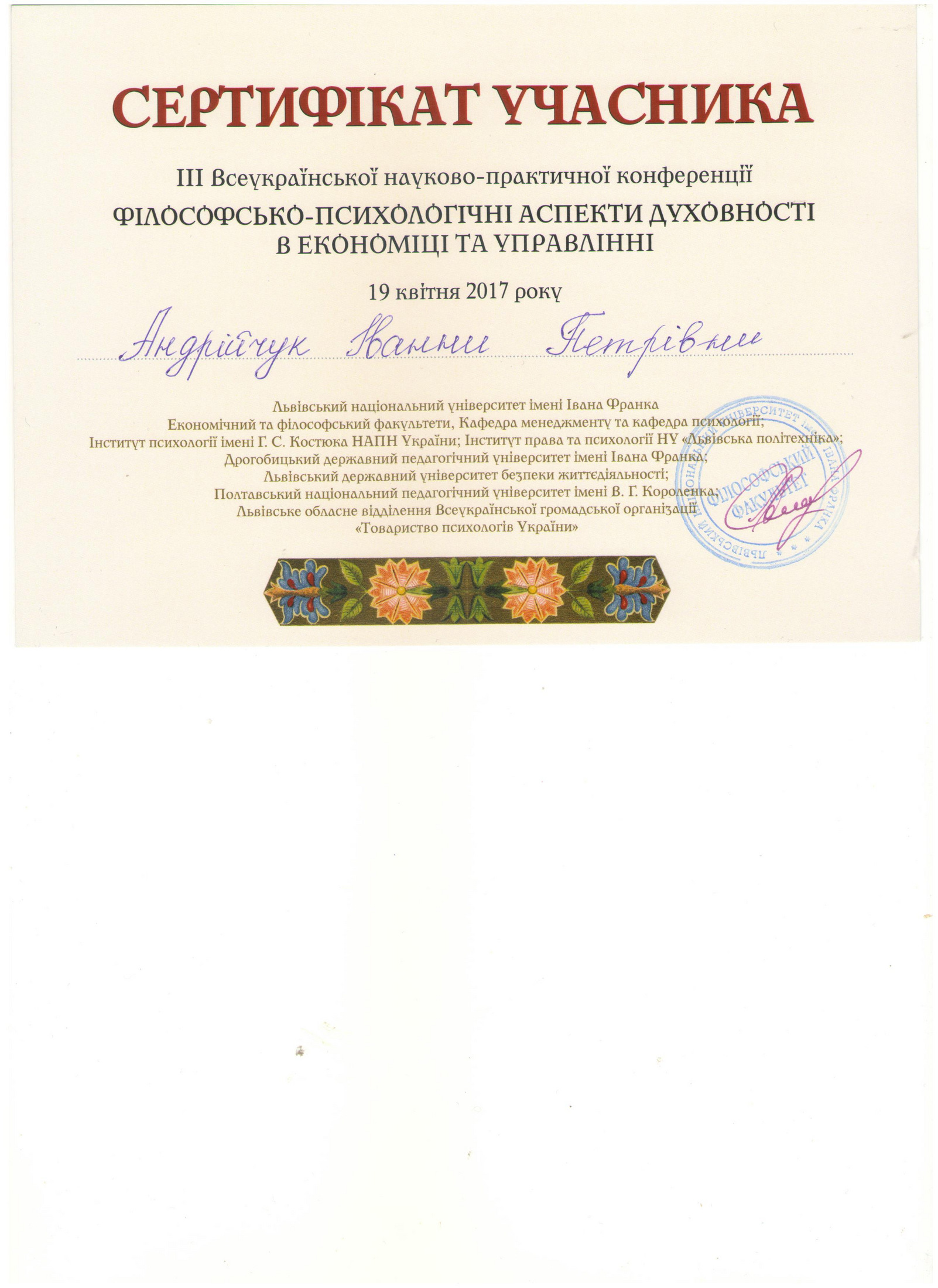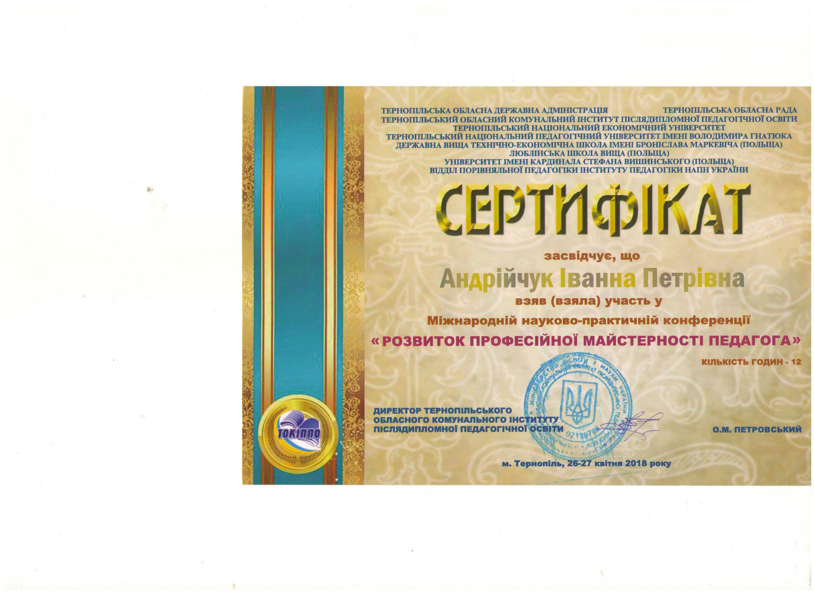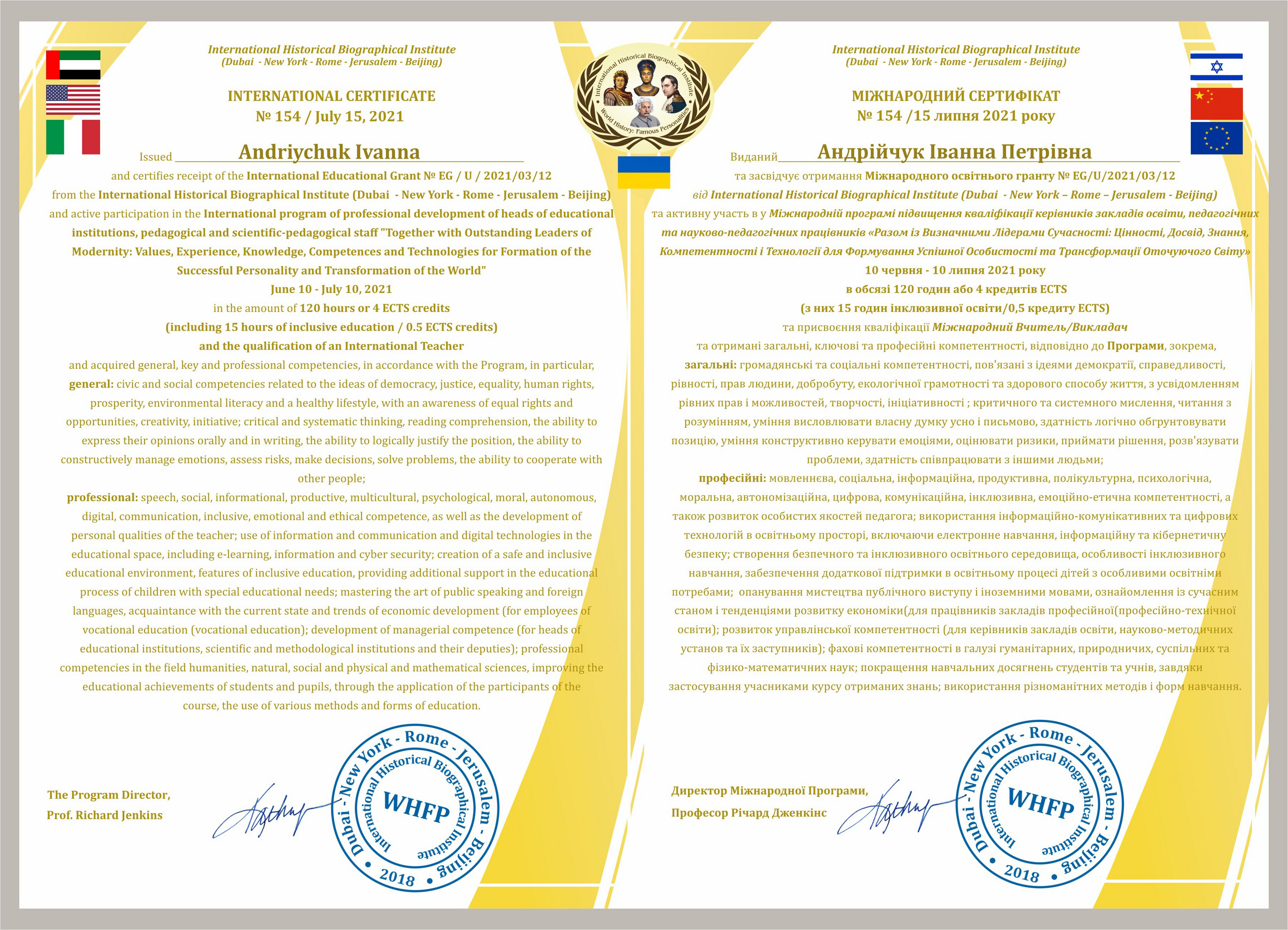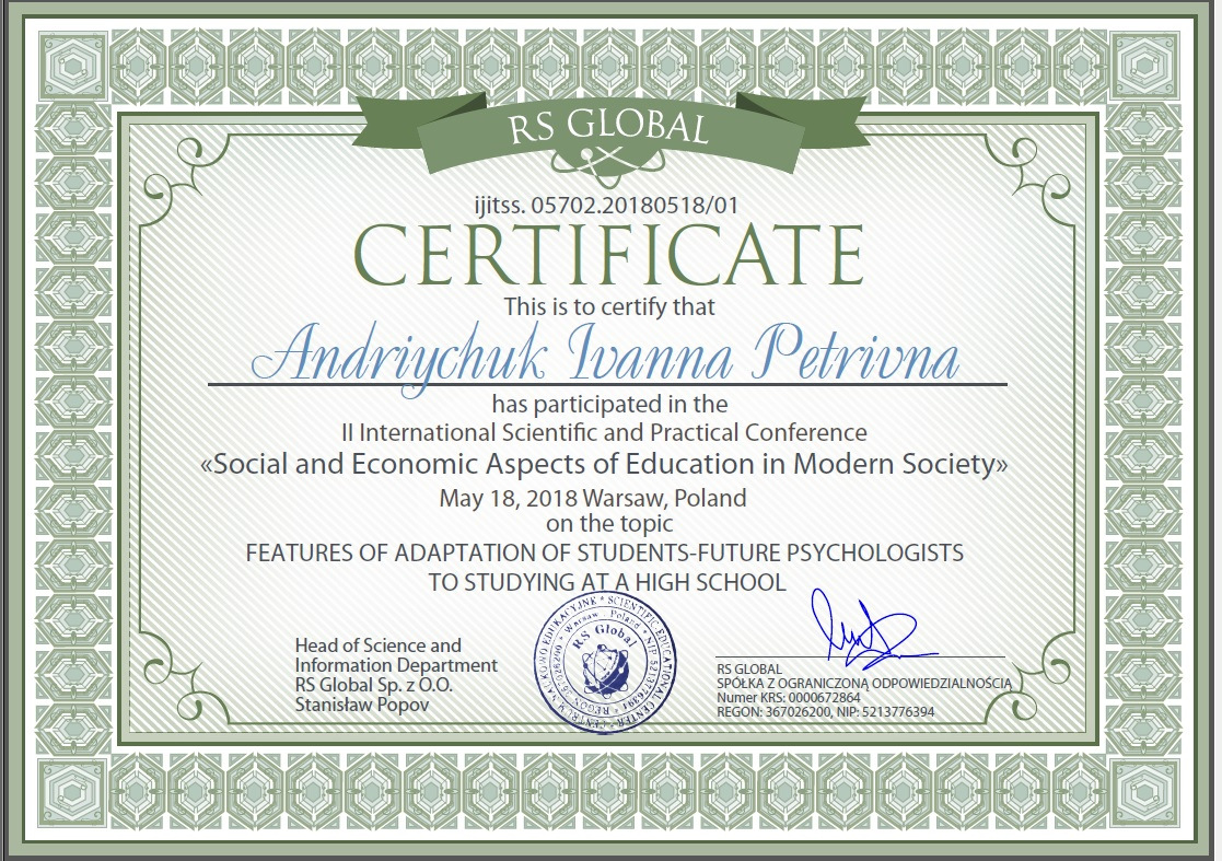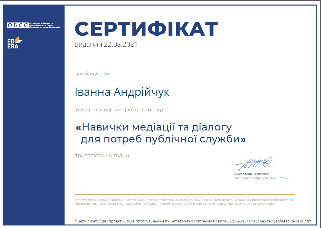 У 2001 – 2002 рр. закінчила базовий курс з Позитивної психотерапії та отримала сертифікат консультанта в напрямку позитивної психотерапії.