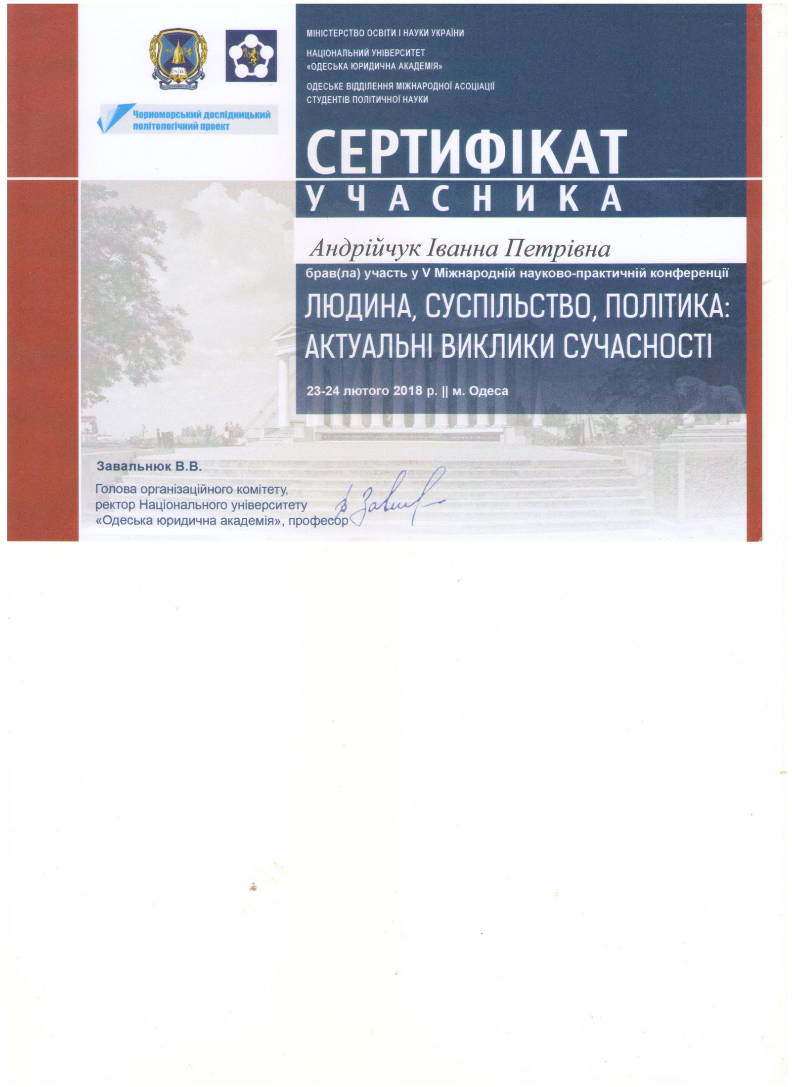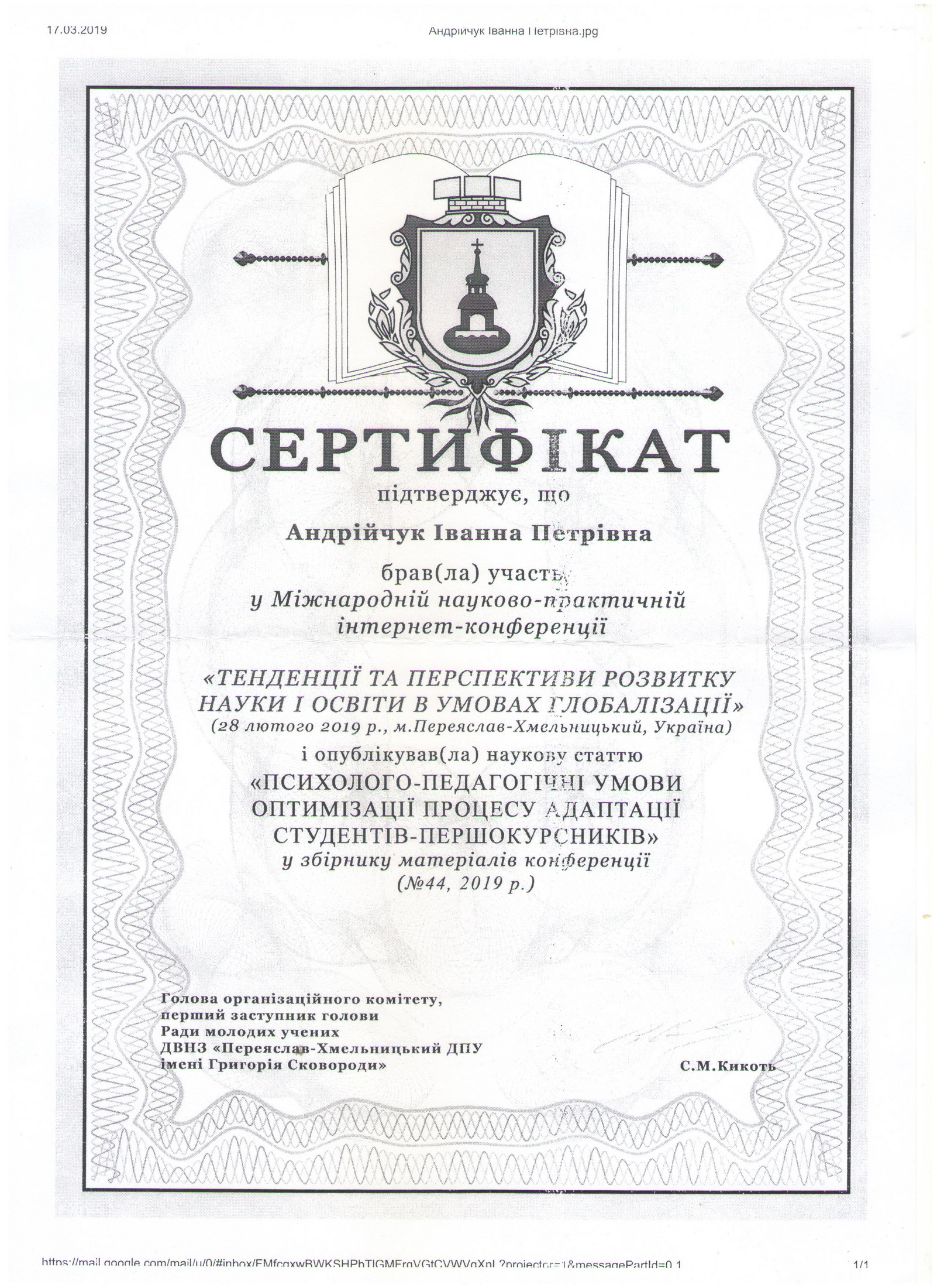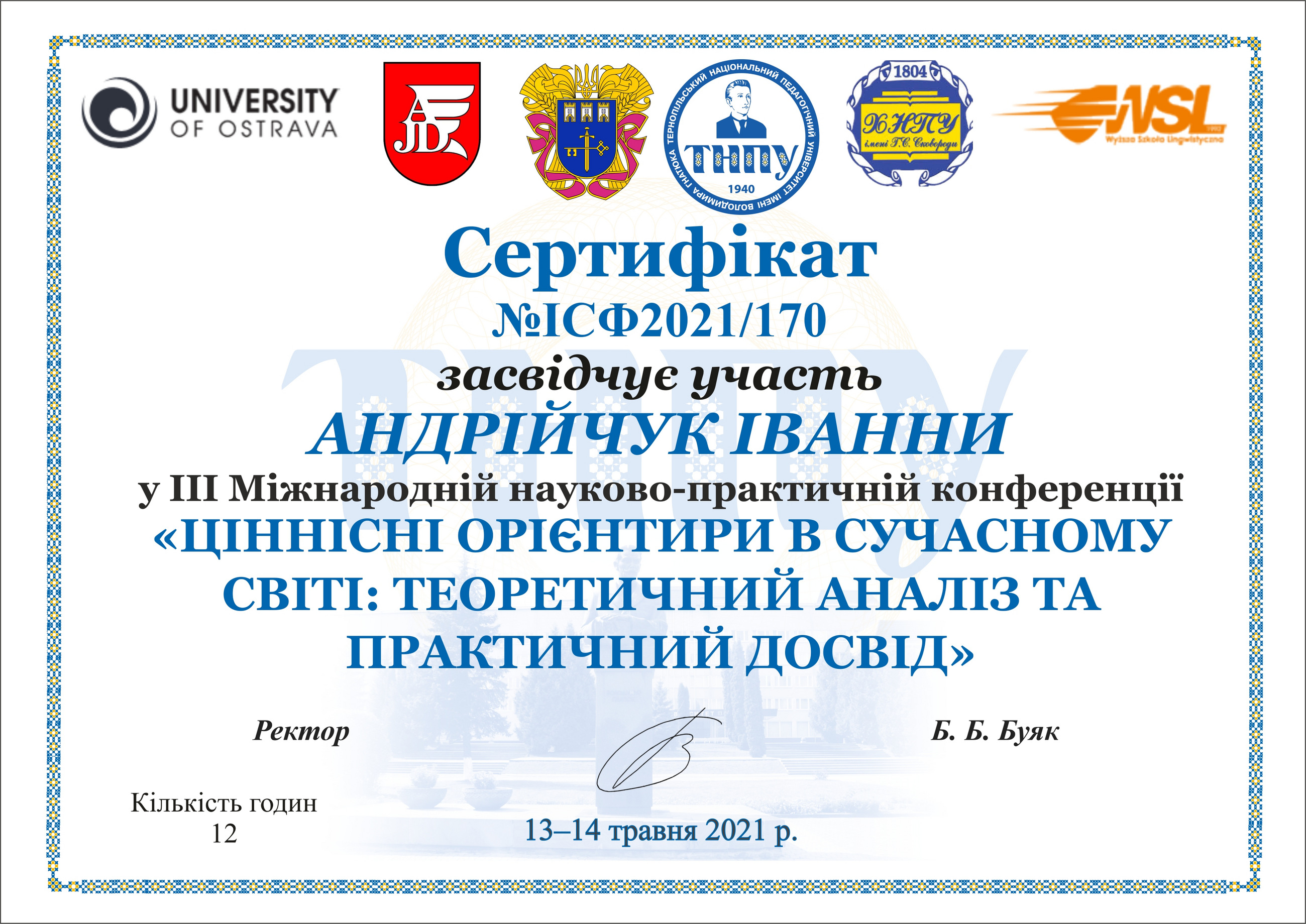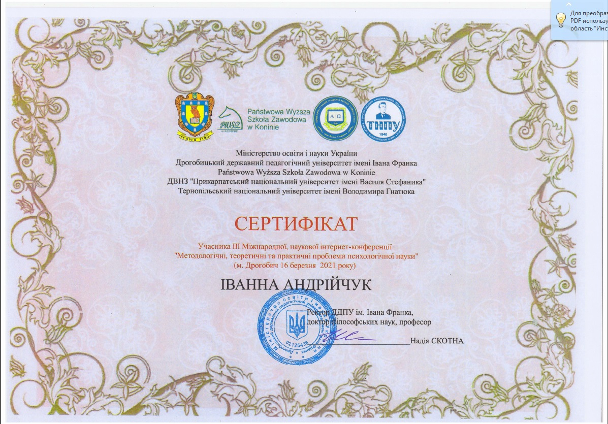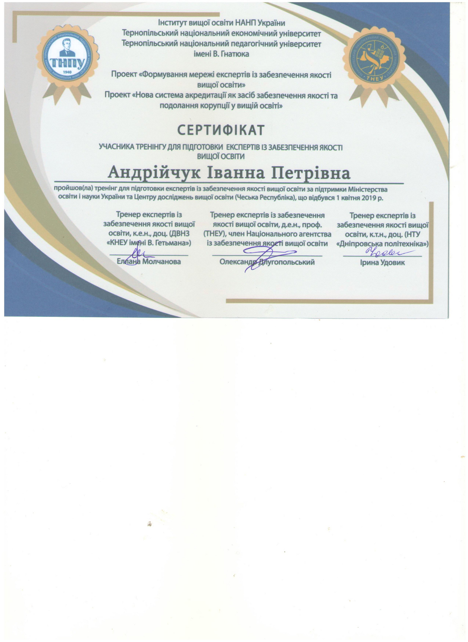 У 2001 – 2002 рр. закінчила базовий курс з Позитивної психотерапії та отримала сертифікат консультанта в напрямку позитивної психотерапії.