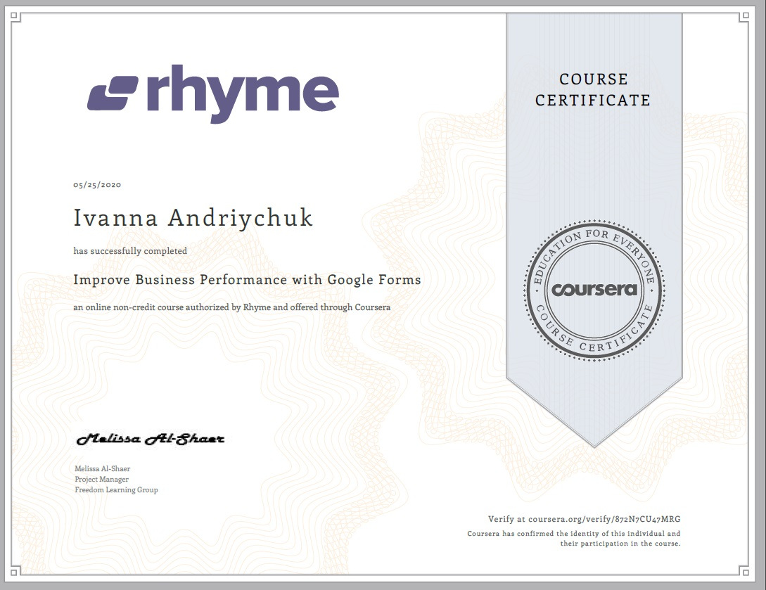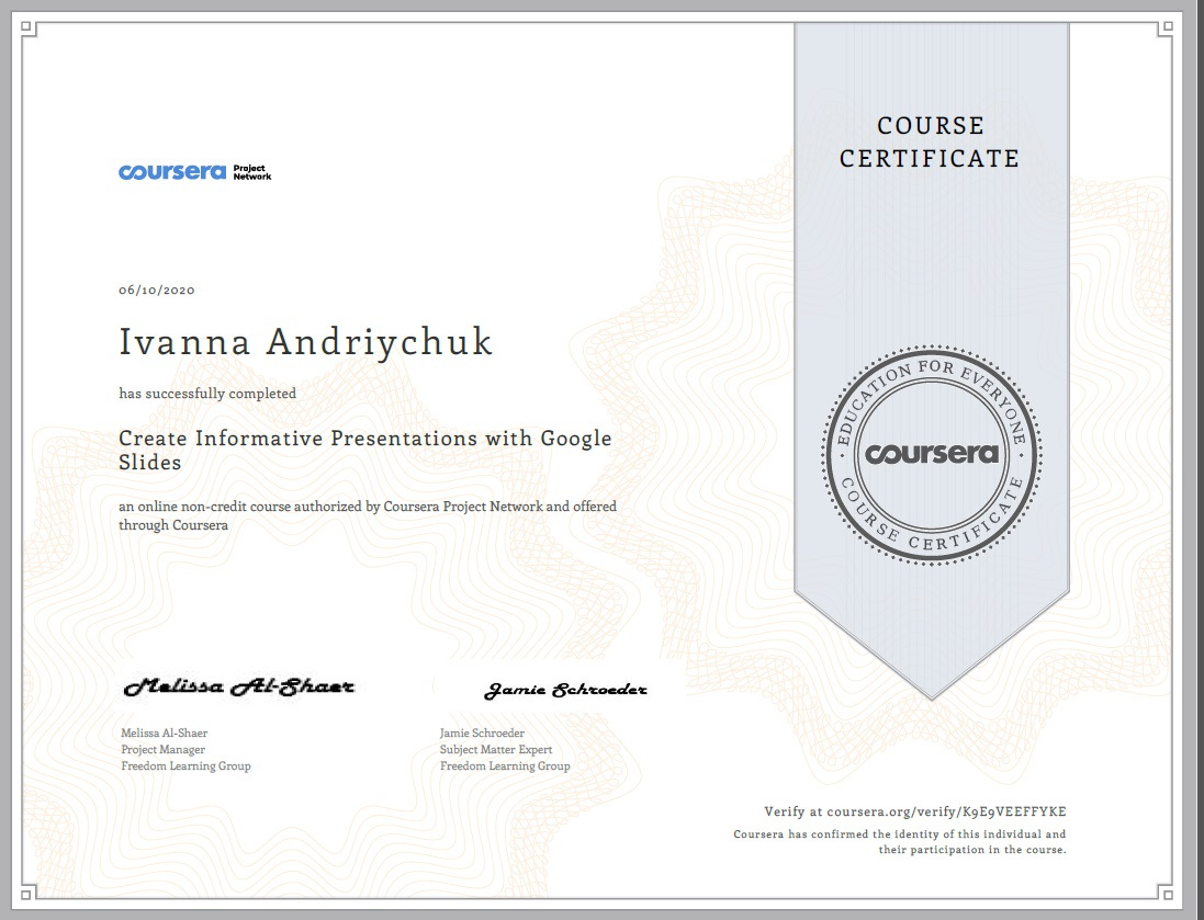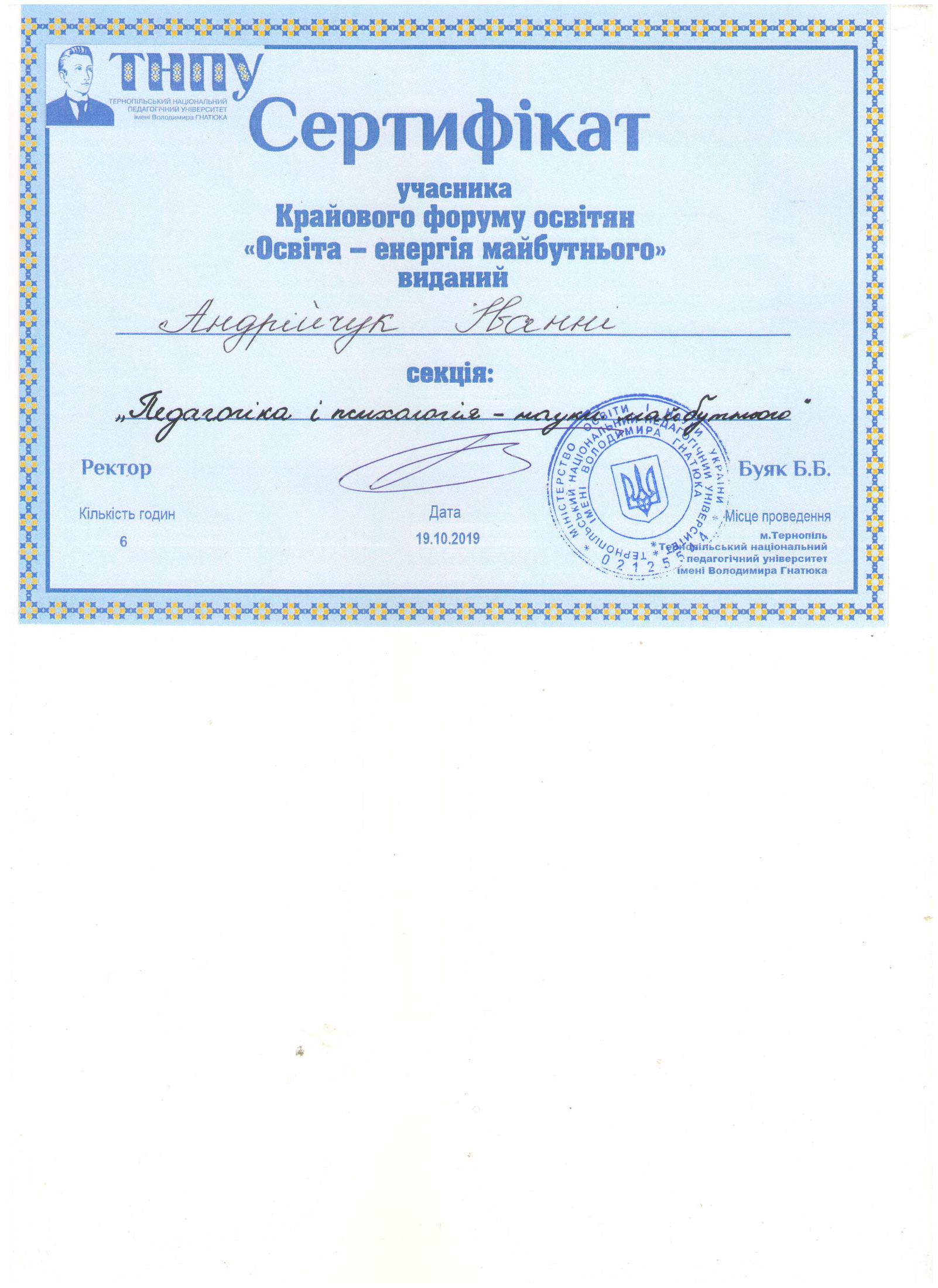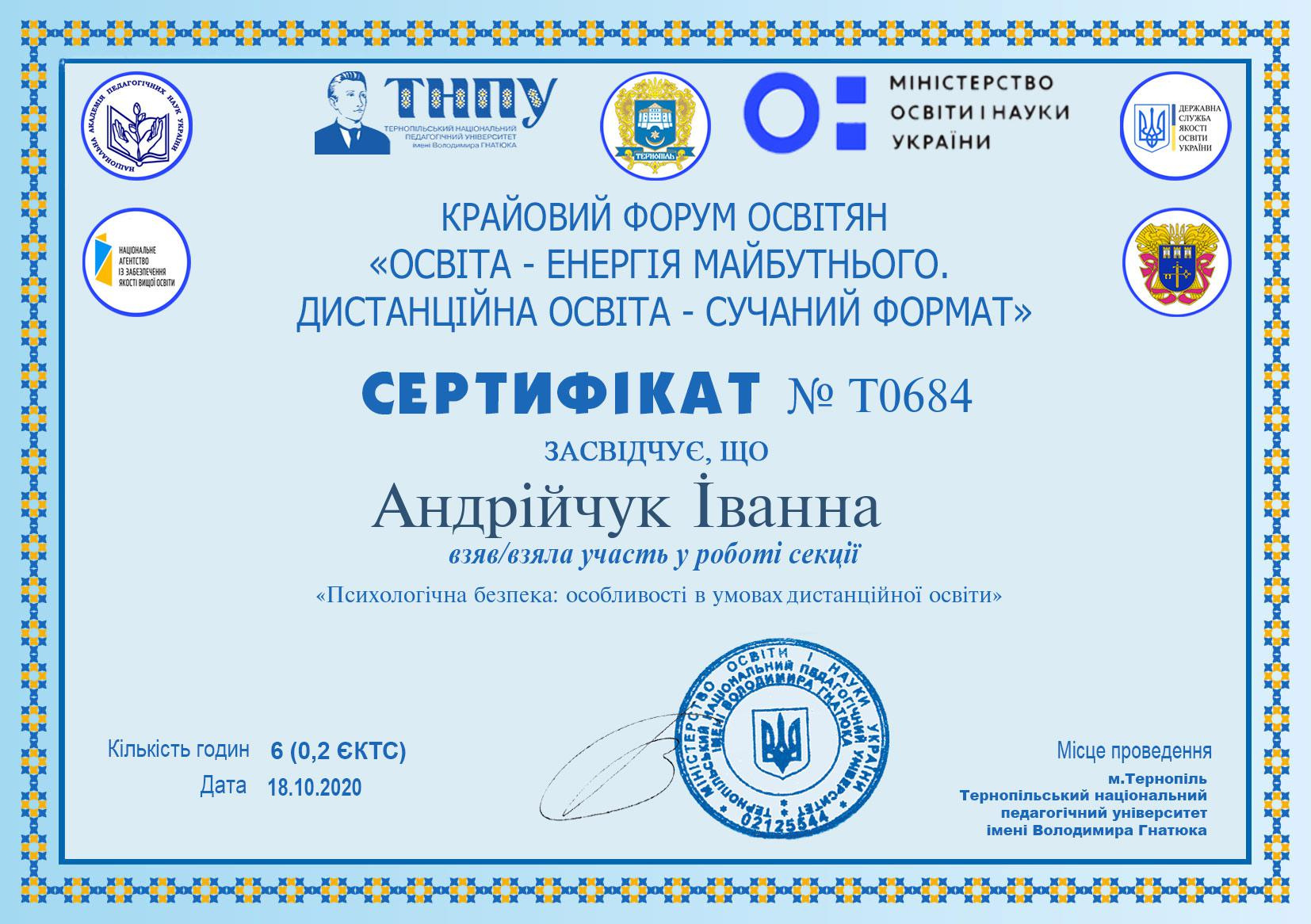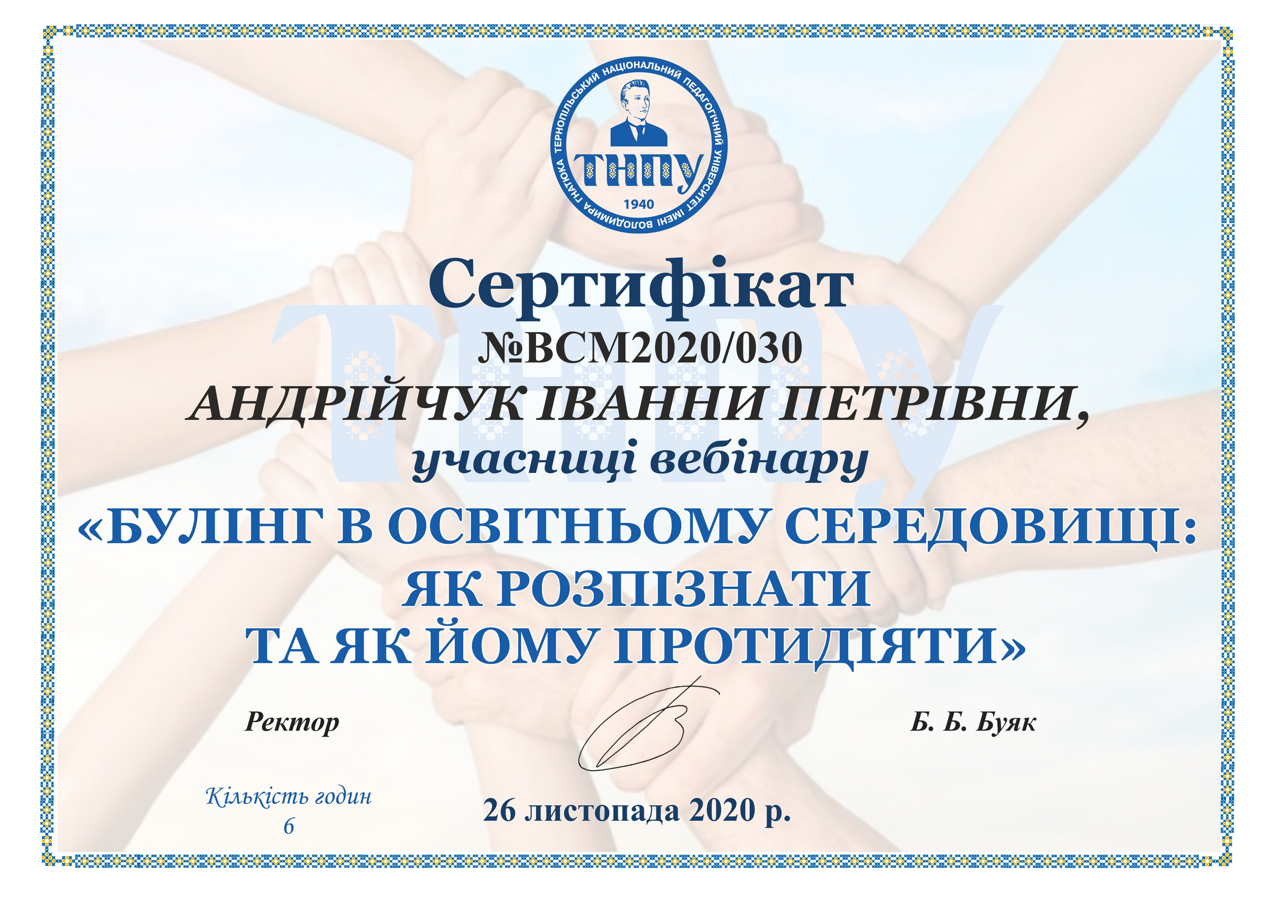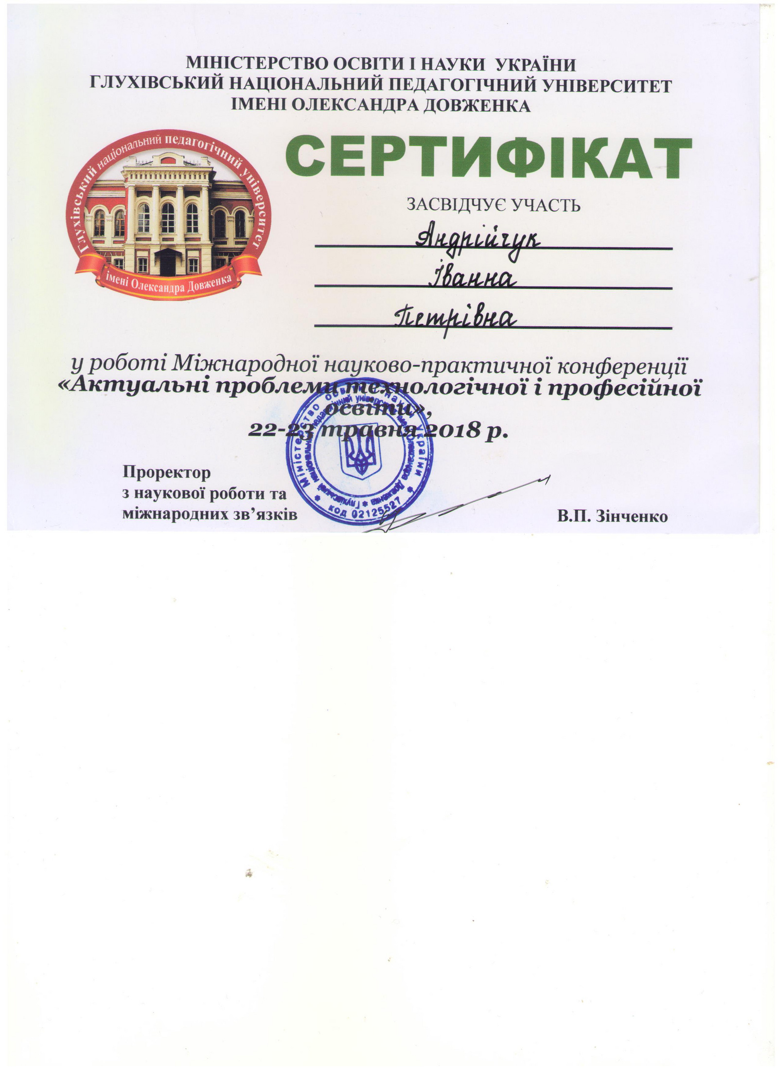 У 2001 – 2002 рр. закінчила базовий курс з Позитивної психотерапії та отримала сертифікат консультанта в напрямку позитивної психотерапії.
