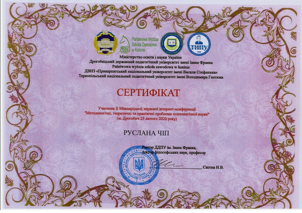 1. Чіп Р. С. Феномен ідентичності особистості у контексті основних психологічних концепцій // Становлення культури життєвого самовизначення сучасної молоді: психологічна теорія і практика : монографія / за ред. Г. К. Радчук. Тернопіль, 2016. С. 42–67.