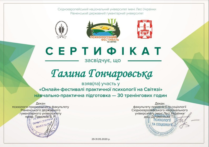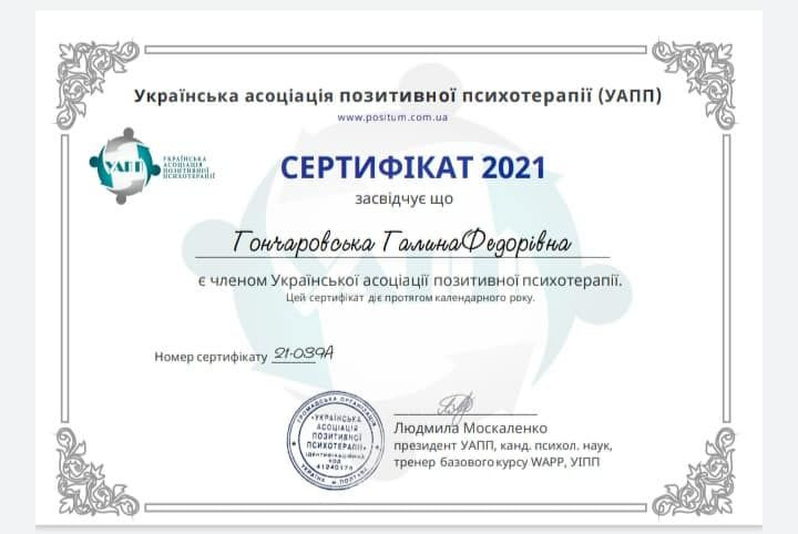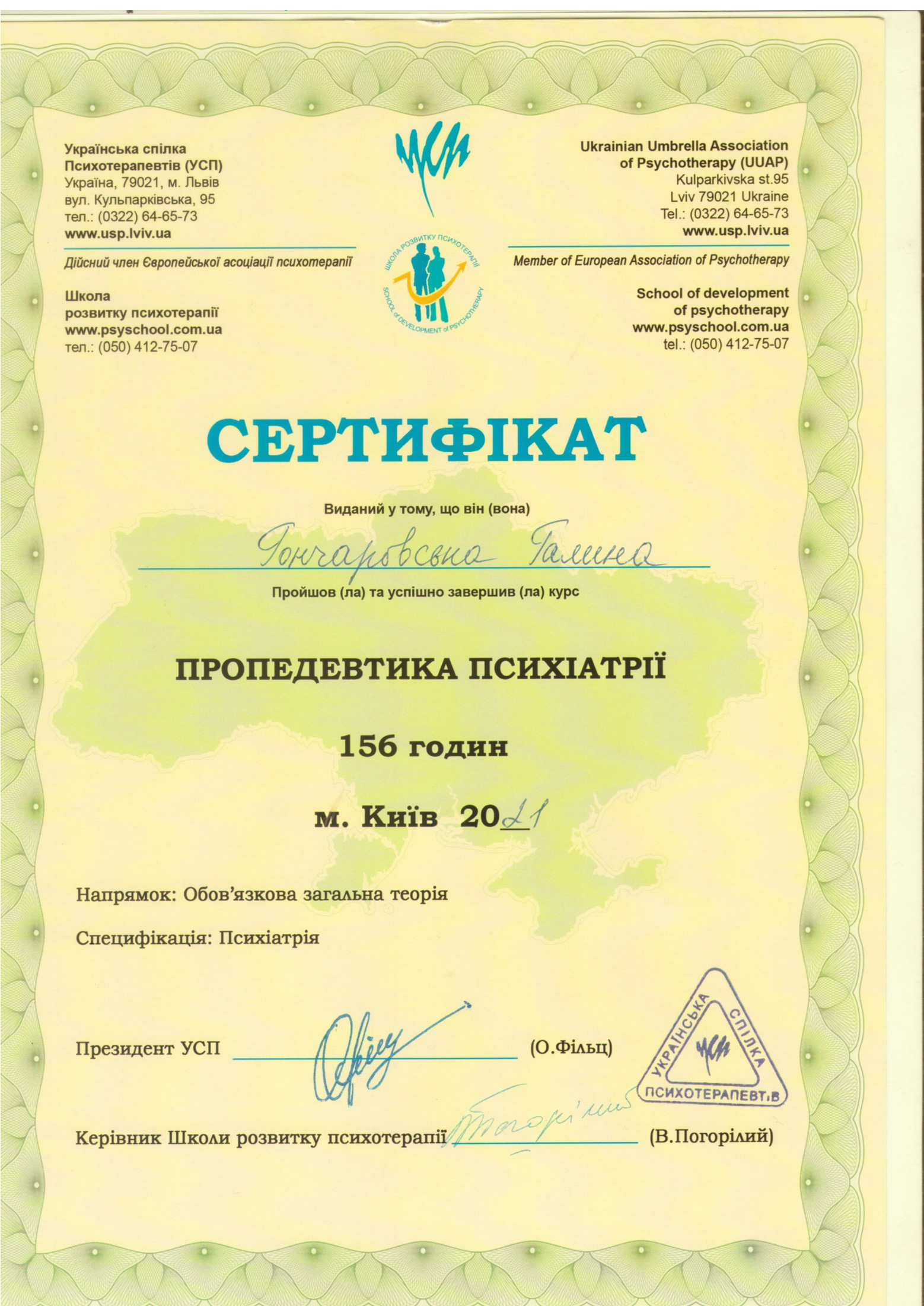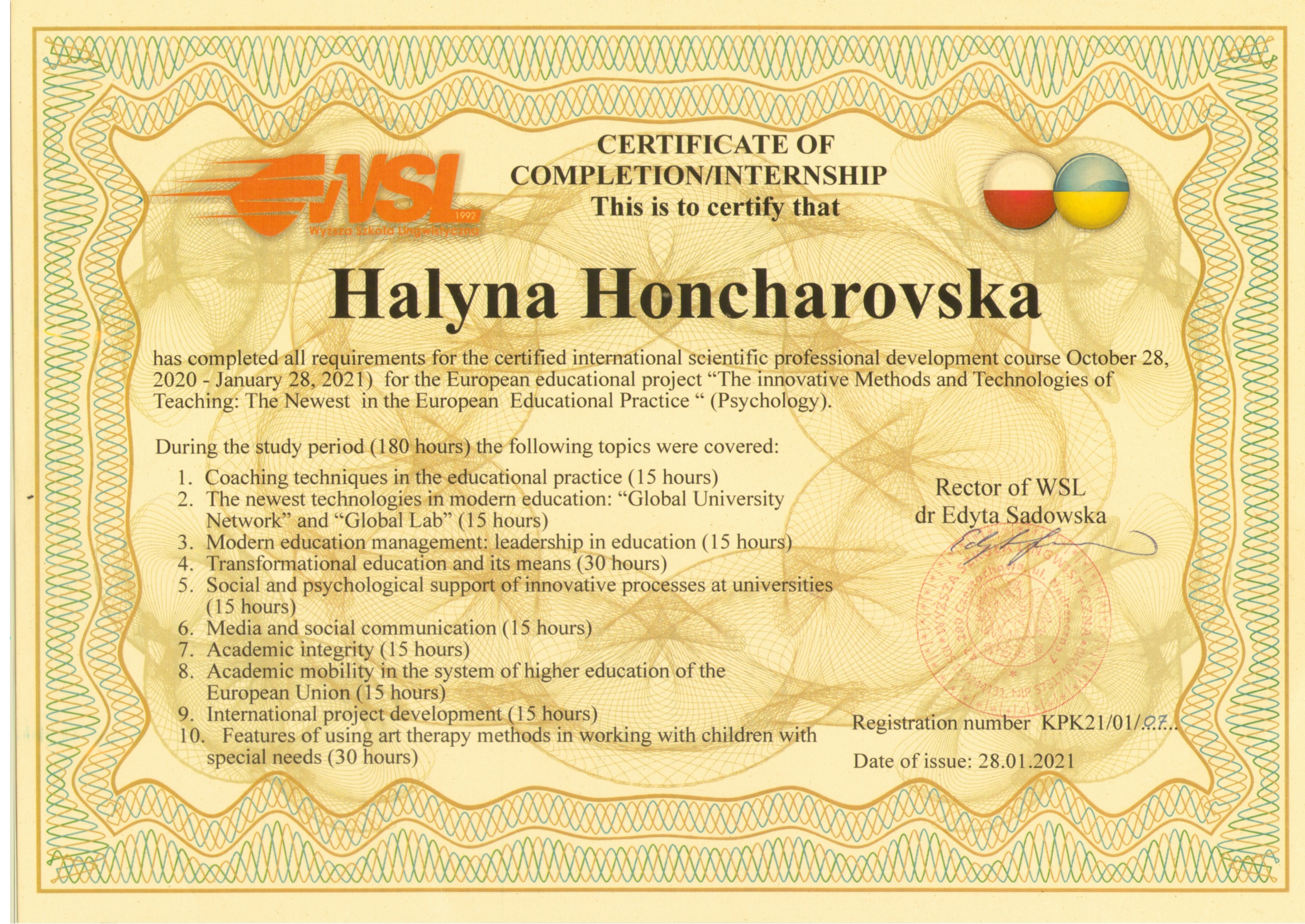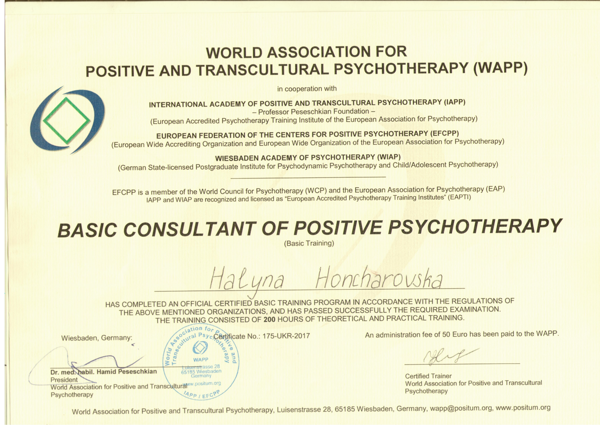 2016-2017 рр. пройшла навчання в Українському Інституті Позитивної крос-культурної психотерапії та менеджменту з курсу "Основи позитивної психотерапії" та отримала сертифікат консультанта в напрямку позитивної психотерапії.