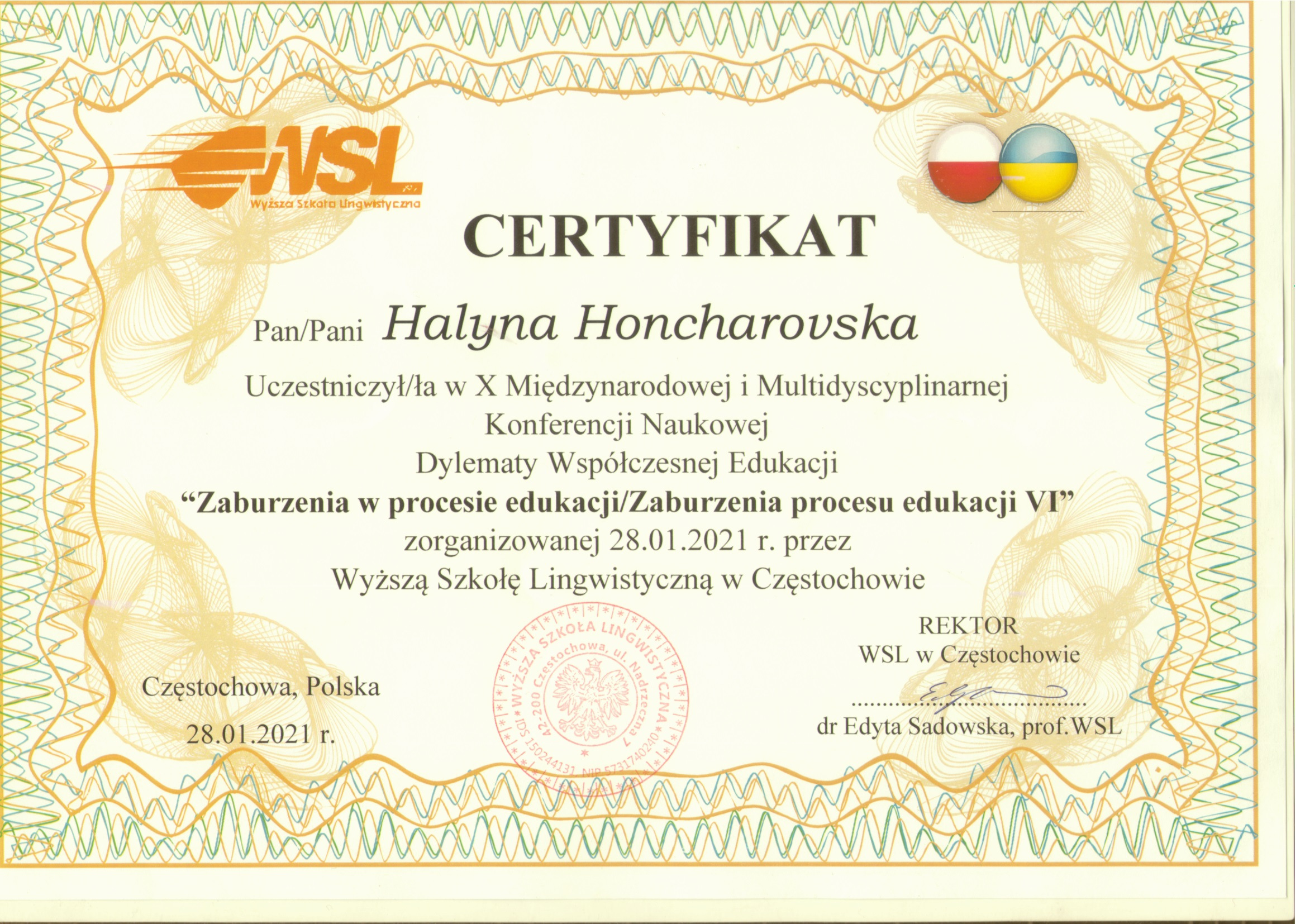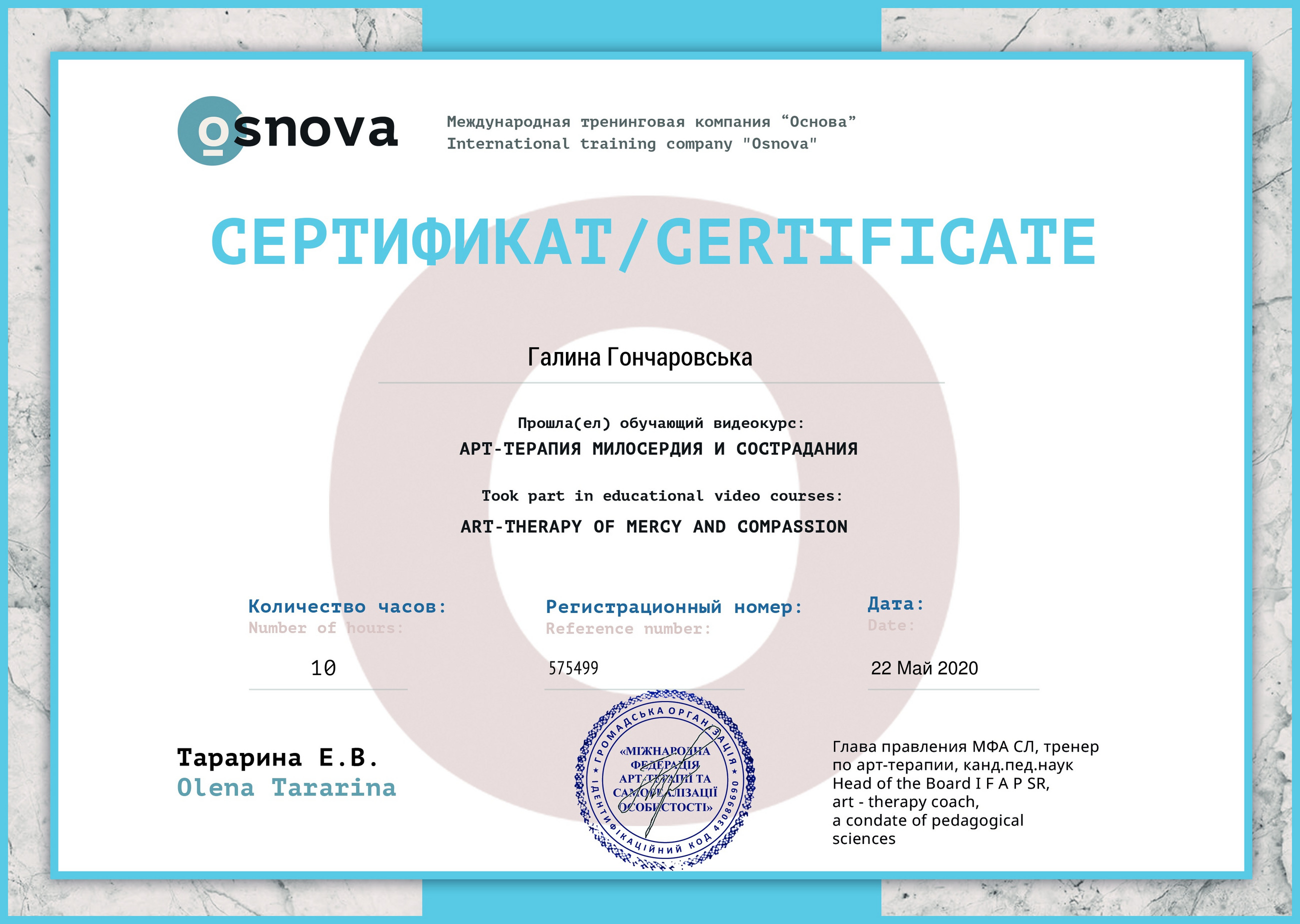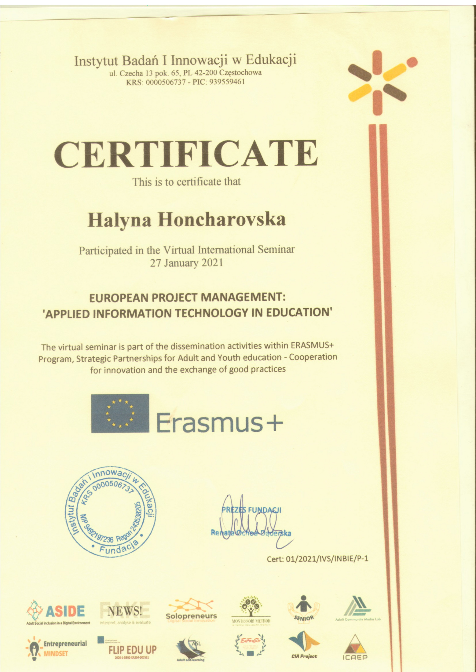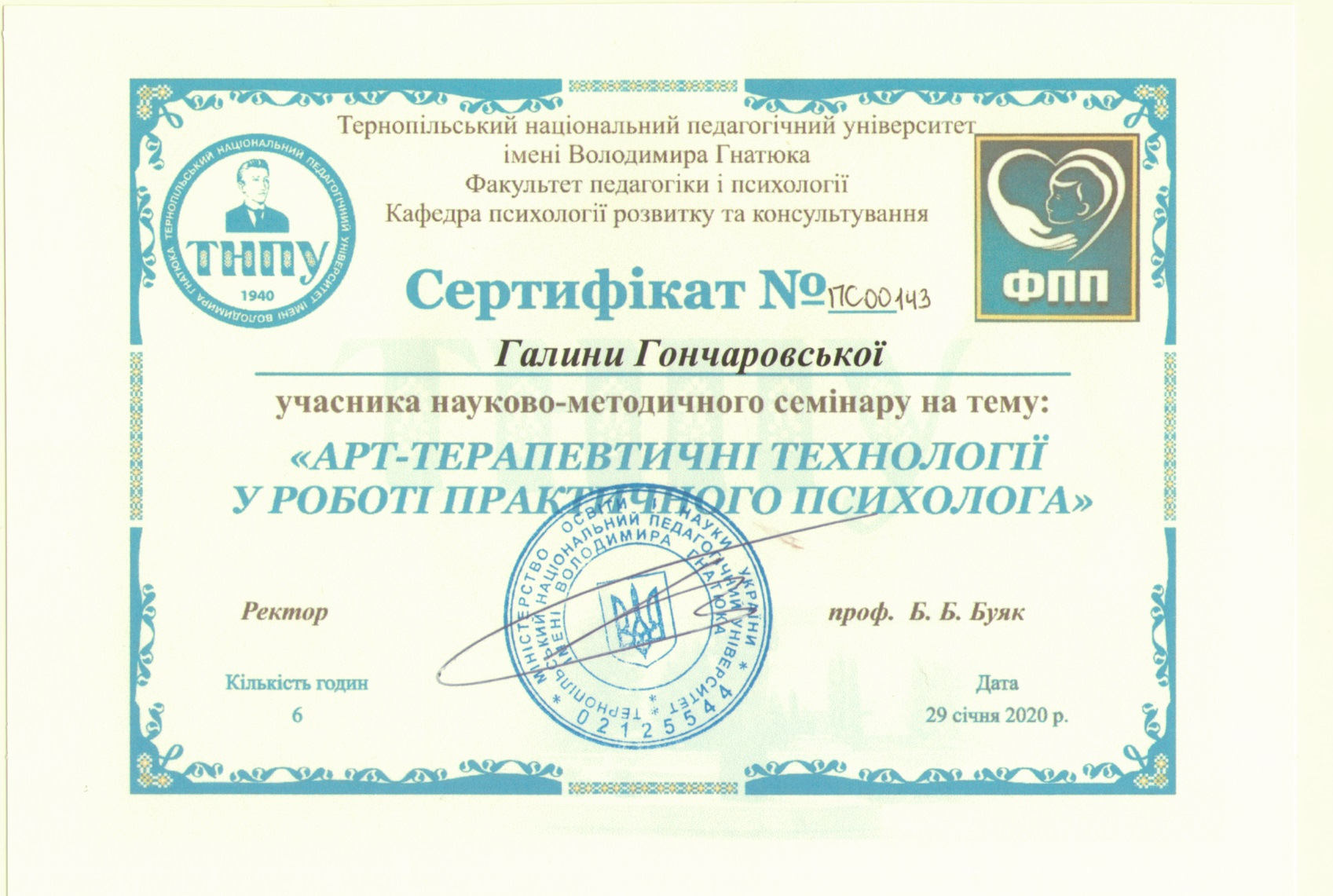 2016-2017 рр. пройшла навчання в Українському Інституті Позитивної крос-культурної психотерапії та менеджменту з курсу "Основи позитивної психотерапії" та отримала сертифікат консультанта в напрямку позитивної психотерапії.