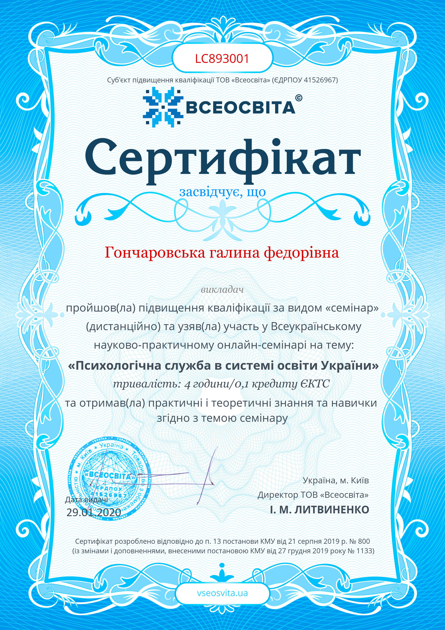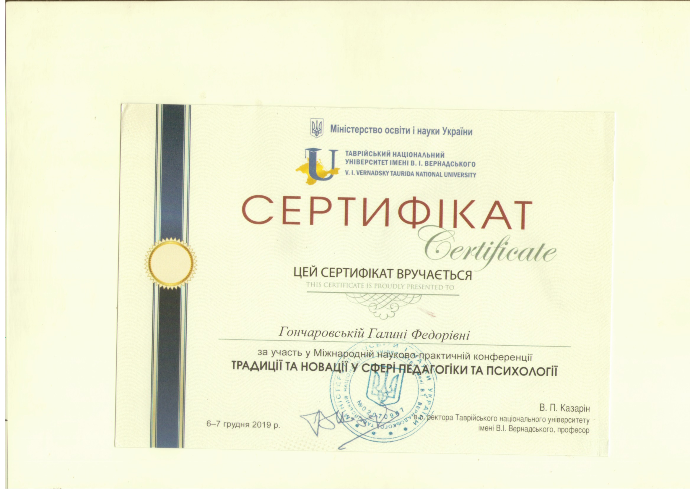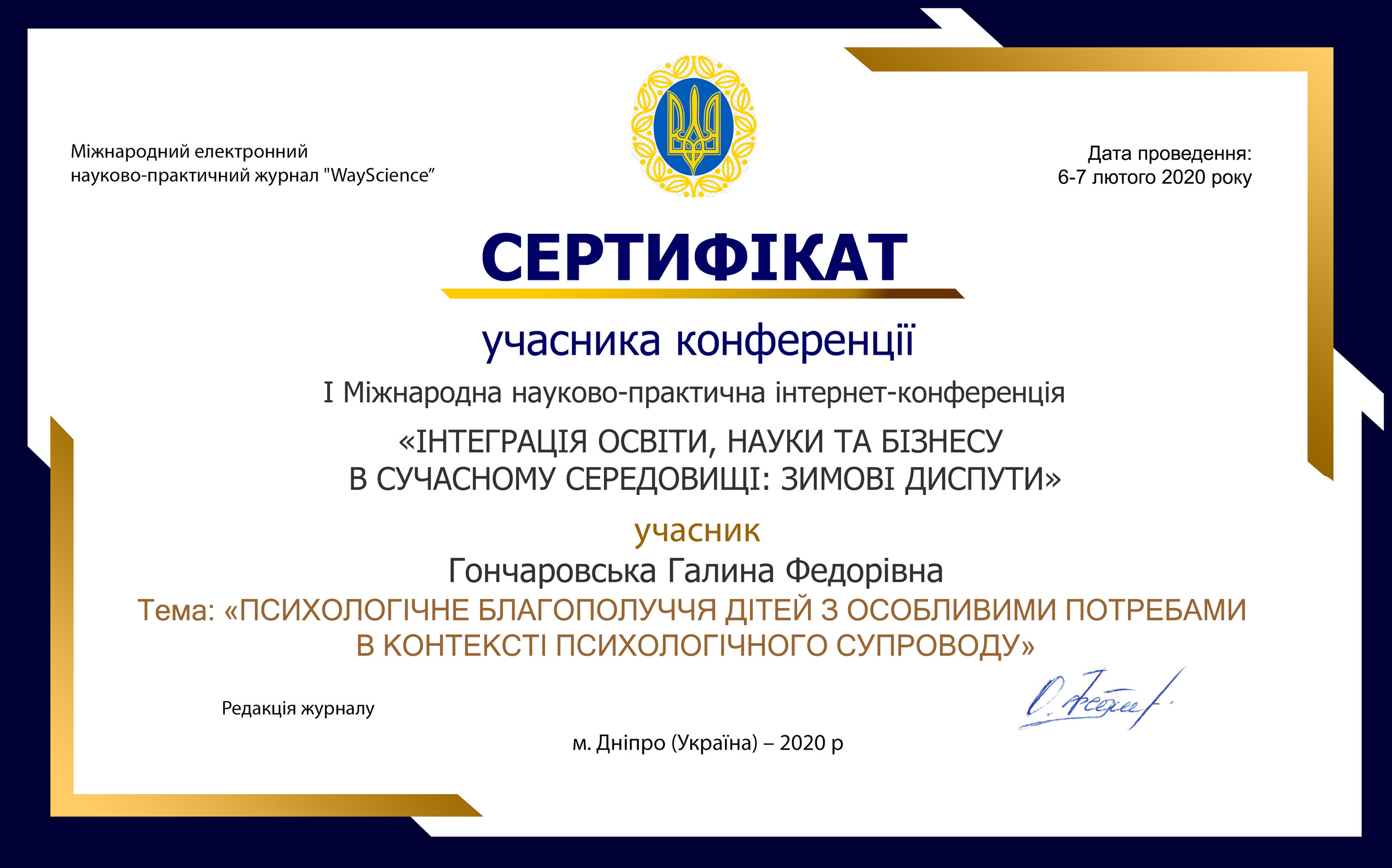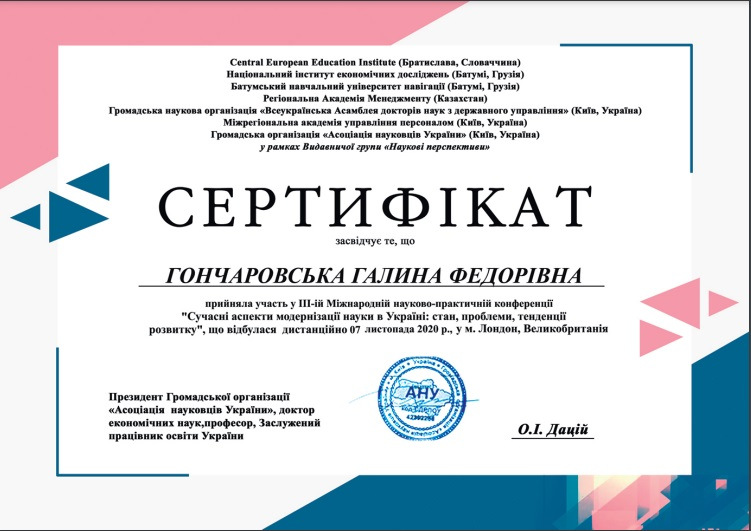 2016-2017 рр. пройшла навчання в Українському Інституті Позитивної крос-культурної психотерапії та менеджменту з курсу "Основи позитивної психотерапії" та отримала сертифікат консультанта в напрямку позитивної психотерапії.