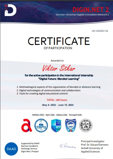 З 04 травня по 10 червня 2022 р. пройшов міжнародне стажування за темою «Digital Future: Blended Learning» («Цифрове майбутнє: змішане навчання») на базі проєкту Digin.Net 2 за підтримки DAAD. German-Ukrainian Digital Innovation Network 2. Отримано сертифікат DN 202205134. Обсяг стажування 180 год.