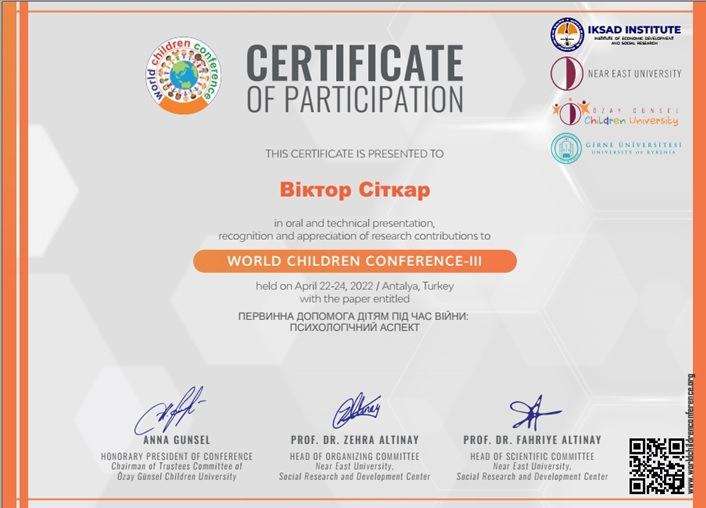 3.21. Сіткар Віктор, Сіткар Степан. Первинна допомога дітям під час війни: психологічний аспект. WORLD CHILDREN CONFERENCE-III. April 22-24, 2022. Antalya-Turkey. Proceedings Book Volume-I. Р. 447-451. IKSAD GLOBAL PUBLISHING HOUSE. ISBN: 978-625-8377-38-5. URL : https://www.worldchildrenconference.org/_files/ugd/614b1f_8f1d1021420548d6b751ca8af54f055f.pdf/.