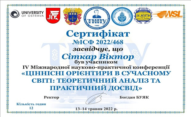 1. Сіткар В., Сіткар С. Вплив війни на зміну людських цінностей: соціально-психологічний аспект. Ціннісні орієнтири в сучасному світі: теоретичний аналіз та практичний досвід: збірник тез ІV Міжнародної науково-практичної конференції, 13-14 травня 2022 року, м. Тернопіль. ТНПУ ім.В.Гнатюка. Ред. кол.: Морська Н. Л., Литвин Л. М., Поперечна Г. А. Тернопіль : Вектор, 2022. С 73-79.