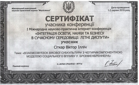 4. Сіткар В. І. Взаємозв’язок вікової субкультури з чотирикомпонентною моделлю соціального впливу У. Бронфенбреннера. / В.І. Сіткар // Міжнародний електронний науково-практичний журнал «Way Science». Інтеграція освіти, науки та бізнесу в сучасному середовищі: літні диспути: тези доп. І Міжнародної науково-практичної інтернет-конференції, 1-2 серпня 2019 р. – Дніпро, 2019. - С. 649-655.