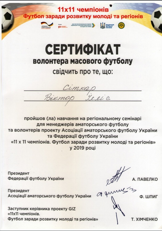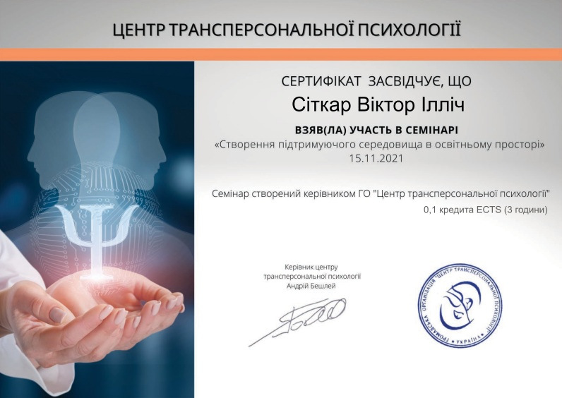 З 01 лютого 2018 року зарахований членом Європейської асоціації педагогів, психологів та медиків «Science»). (посвідчення № 00417, видане ЄАППМ «Science» 01.02.2018 р).
