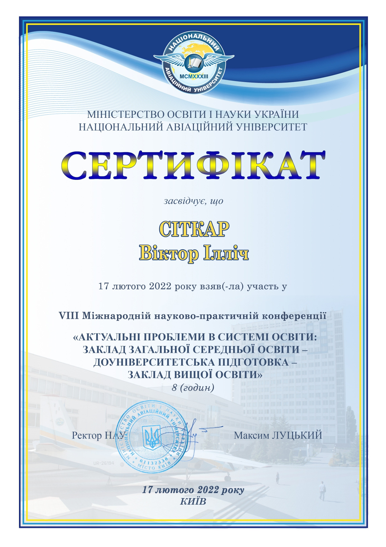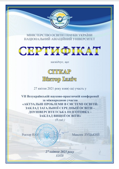7. Сіткар В. Центр довузівської підготовки як важлива складова профорієнтації, контролю та моніторингу знань майбутніх абітурієнтів / Віктор Сіткар, Степан Сіткар // Актуальні проблеми в системі освіти: загальноосвітній навчальний заклад – доуніверситетська підготовка – вищий навчальний заклад : зб. наук. праць матеріалів IV Всеукраїнської науково-практичної конференції, 18 квітня 2018 р., м. Київ, Національний авіаційний університет / наук. ред. Н. П. Муранова. – К. : НАУ, 2019. – С. 152-155.