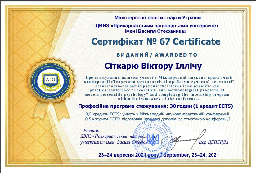 1. Диплом «Софіста» в галузі «Психологія» № DS-016/0046 виданий 02/06/2016 Лондон. Міжнародна академія наук вищої освіти (МАНВО) в рамках міжнародного науково-аналітичного проекту (GISAP)