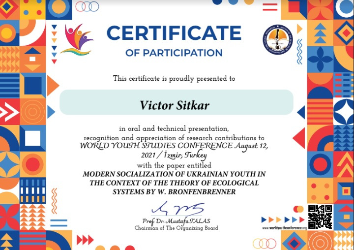 3.19. Сіткар В., Сіткар С. MODERN SOCIALIZATION OF THE UKRAINIAN YOUTH IN THE CONTEXT OF U. BRONFENBRENNER’S ECOLOGICAL SYSTEMS THEORY. WORLD YOUTH STUDIES CONFERENCE August 12, 2021. İzmir, Turkey. Proceedings Book. Editor Cihan YILDIZ CANPOLAT. International Association of Publishers – 2021. Р. 8-14. Режим доступу https://www.worldyouthconference.org/kongre-kitaplari. ISBN - 978-605-70611-7-1