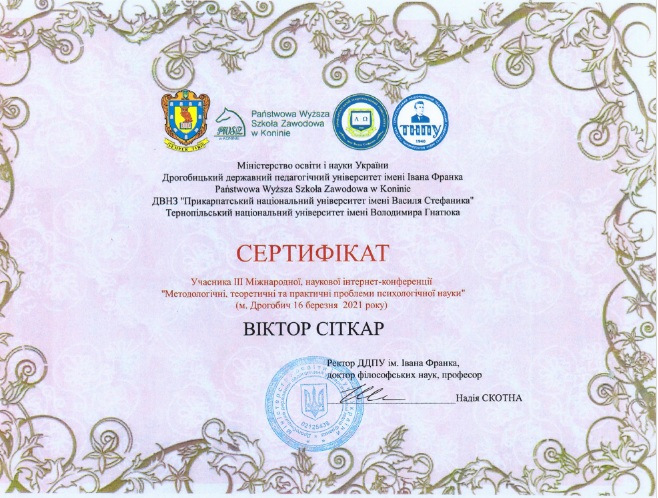 1. Віктор Сіткар. Субкультура і вчинок як сполучники між психологією і культурою / Сіткар Віктор // Методологічні, теоретичні та практичні проблеми психологічної науки. Збірник статей учасників Другої Міжнародної науково-практичної інтернет-конференції «Методологічні, теоретичні та практичні проблеми психологічної науки» (25 лютого 2020 р. м. Дрогобич). Редактори-упорядники М. В. Савчин, А. Р. Зимянський – Дрогобич: «Швидкодрук», 2020. – С. 198-205.