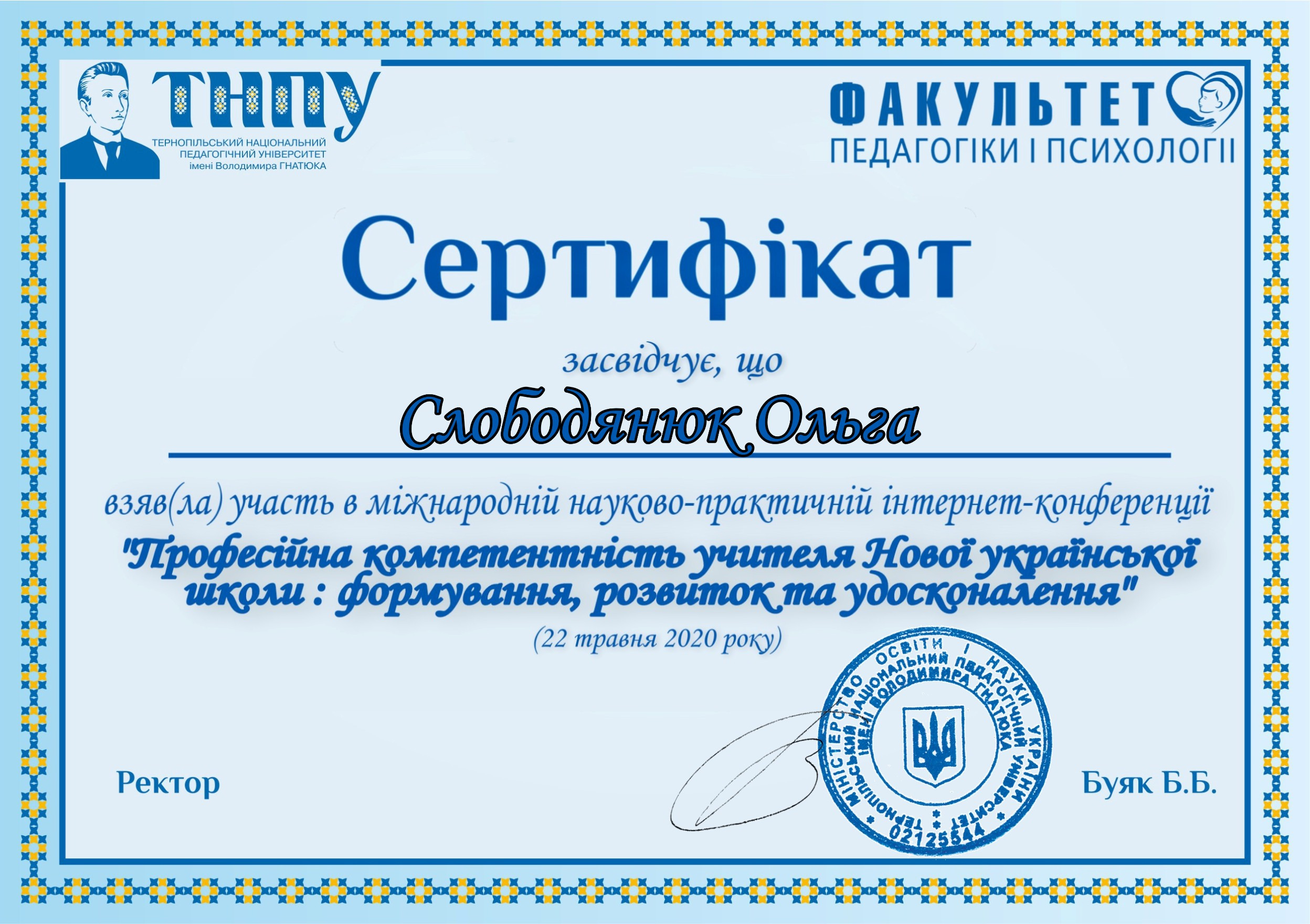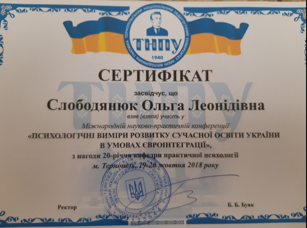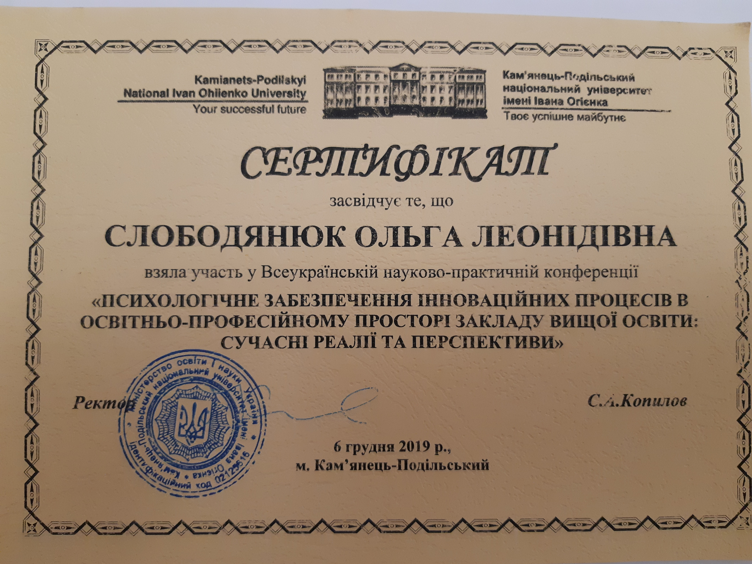 1. Слободянюк О. Діалог в контексті впровадження освітніх інформацій. Психологічне забезпечення інноваційних процесів в освітньо-професійному просторі закладу вищої освіти: сучасні реалії та перспективи: зб. тез доп. всеукр. наук.-практ. конф., м. Кам’янець-Подільський, 6 грудня, 2019 р. Кам’янець-Подільський, 2019. 2. Слободянюк О. Роль соціального інтелекту у професійній підготовці майбутніх педагогів. Методологічні, теоретичні та практичні проблеми психологічної науки: матеріали ІІ міжн. наук. інтернет-конференції, (м. Дрогобич, 25 лютого 2020 р.) Дрогобич, 2020. 3. Слободянюк О. Емпірика розвитку соціального інтелекту педагогів. Eurasian scientific congress: I International Scientific and Practical Conference, (Barcelona, 27-28 January, 2020). Barcelona, 2020. 4. Слободянюк О. Діалогічне навчання в процесі підготовки студентів. «Наука та освіта в дослідженнях молодих учених»: матер.всеукр. наук.-практ. конф.,(14 травня 2020 року Харківський національний педагогічний університеті імені Г. ССковороди). Харків, 2020. |