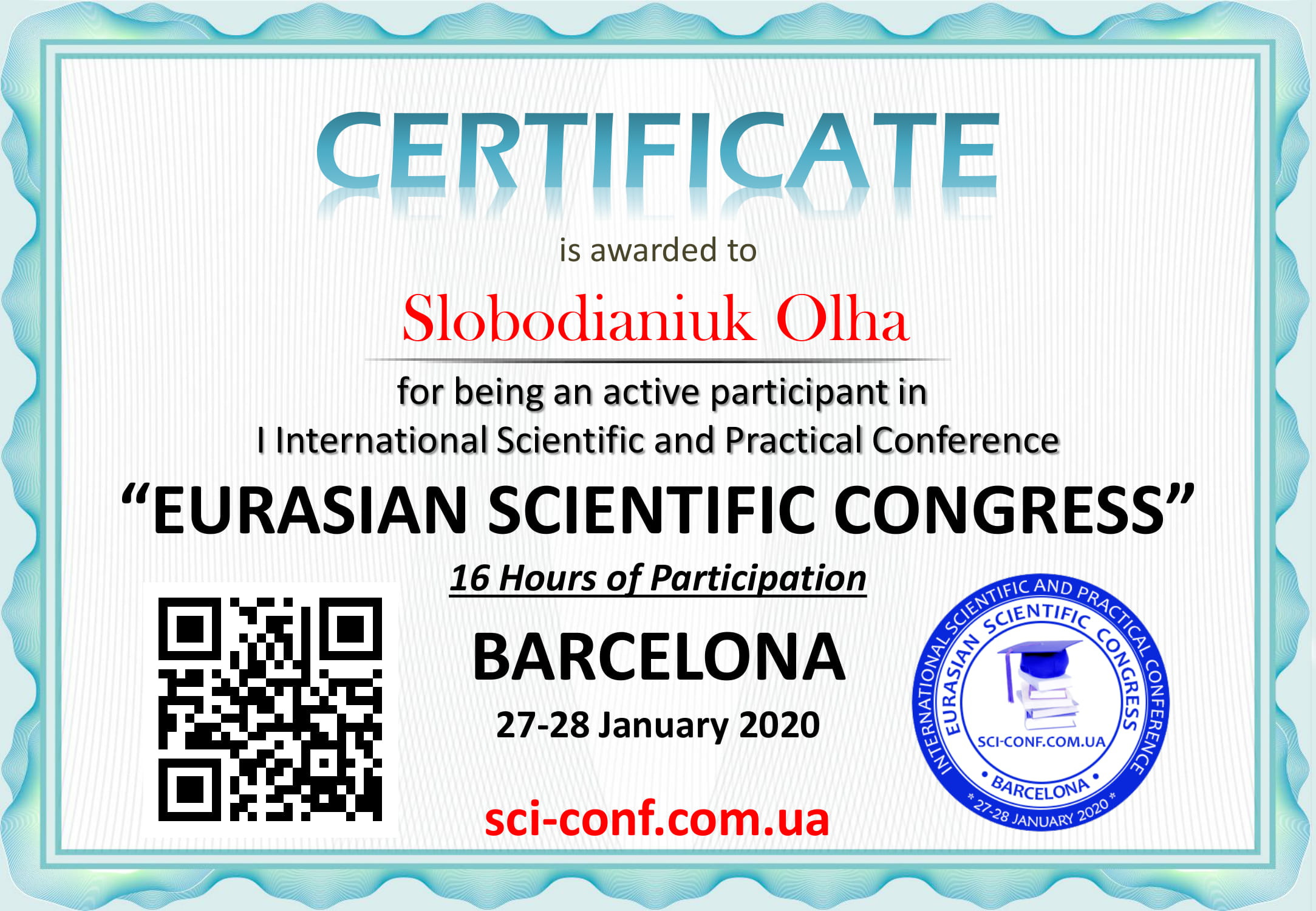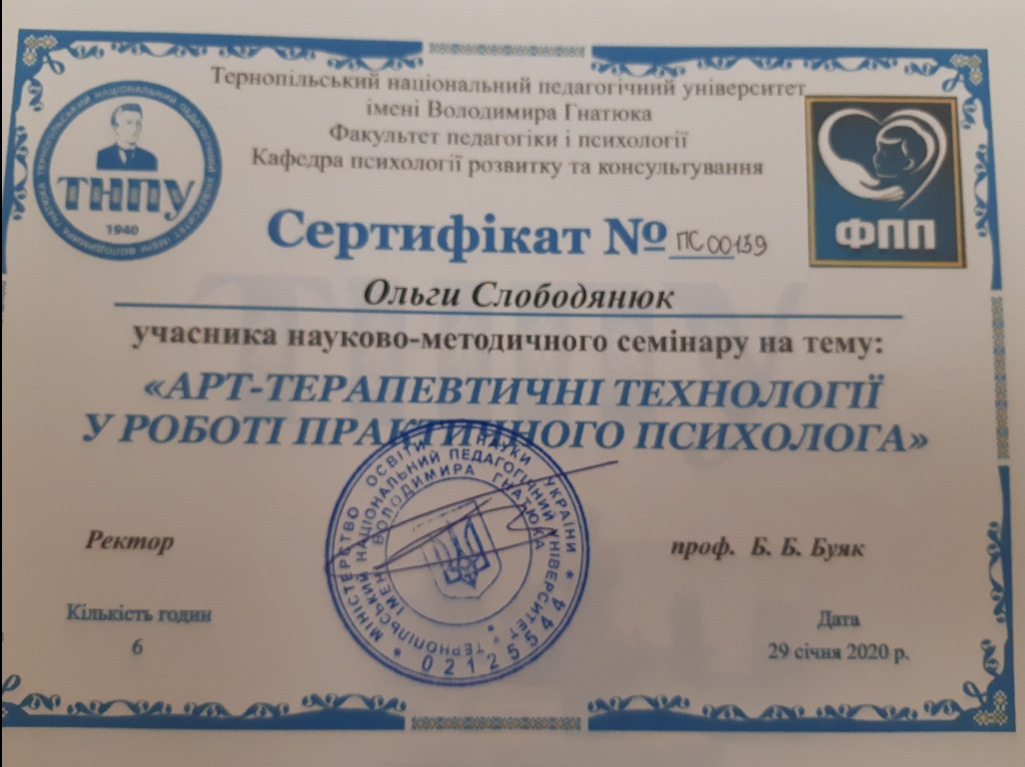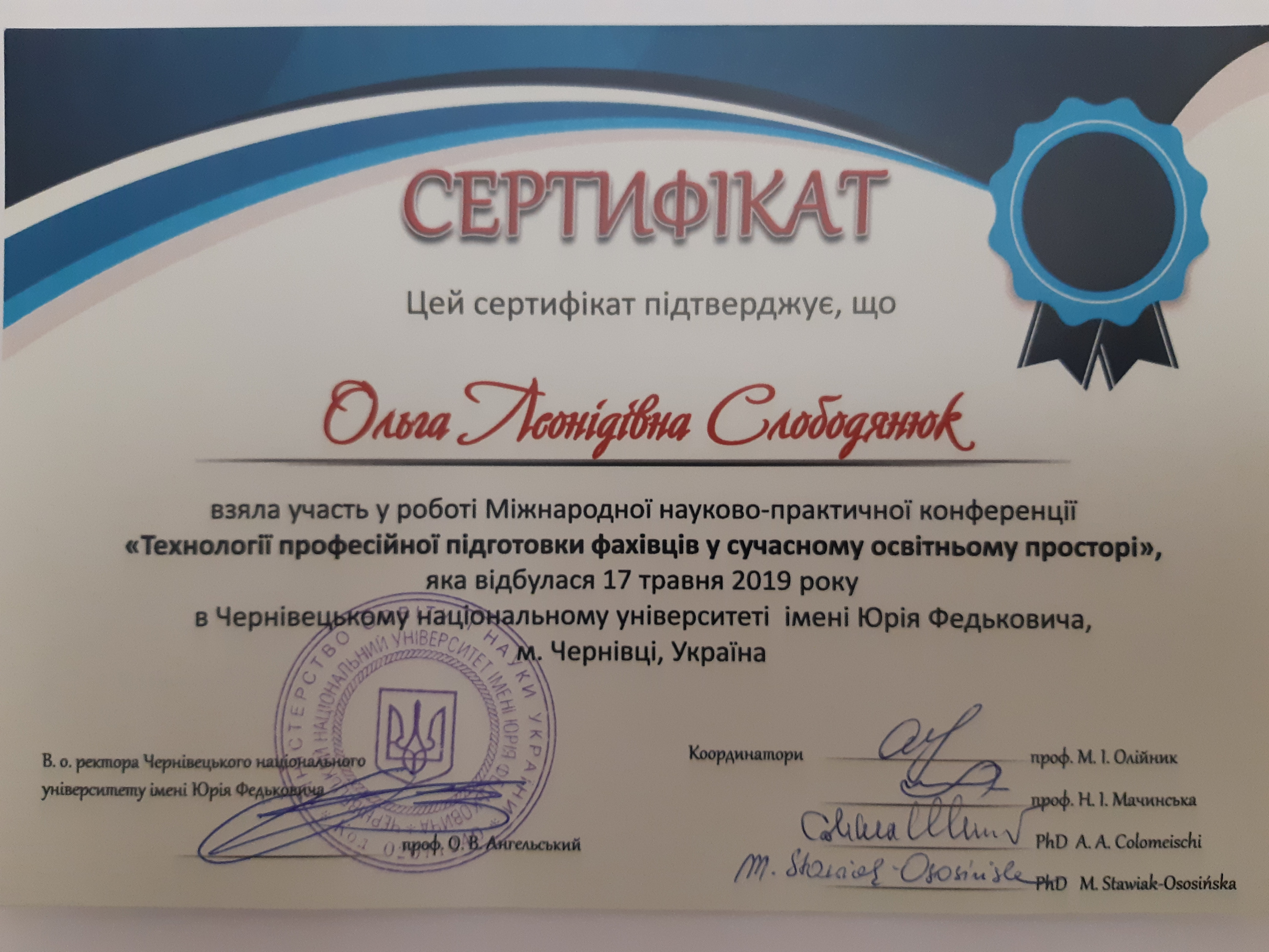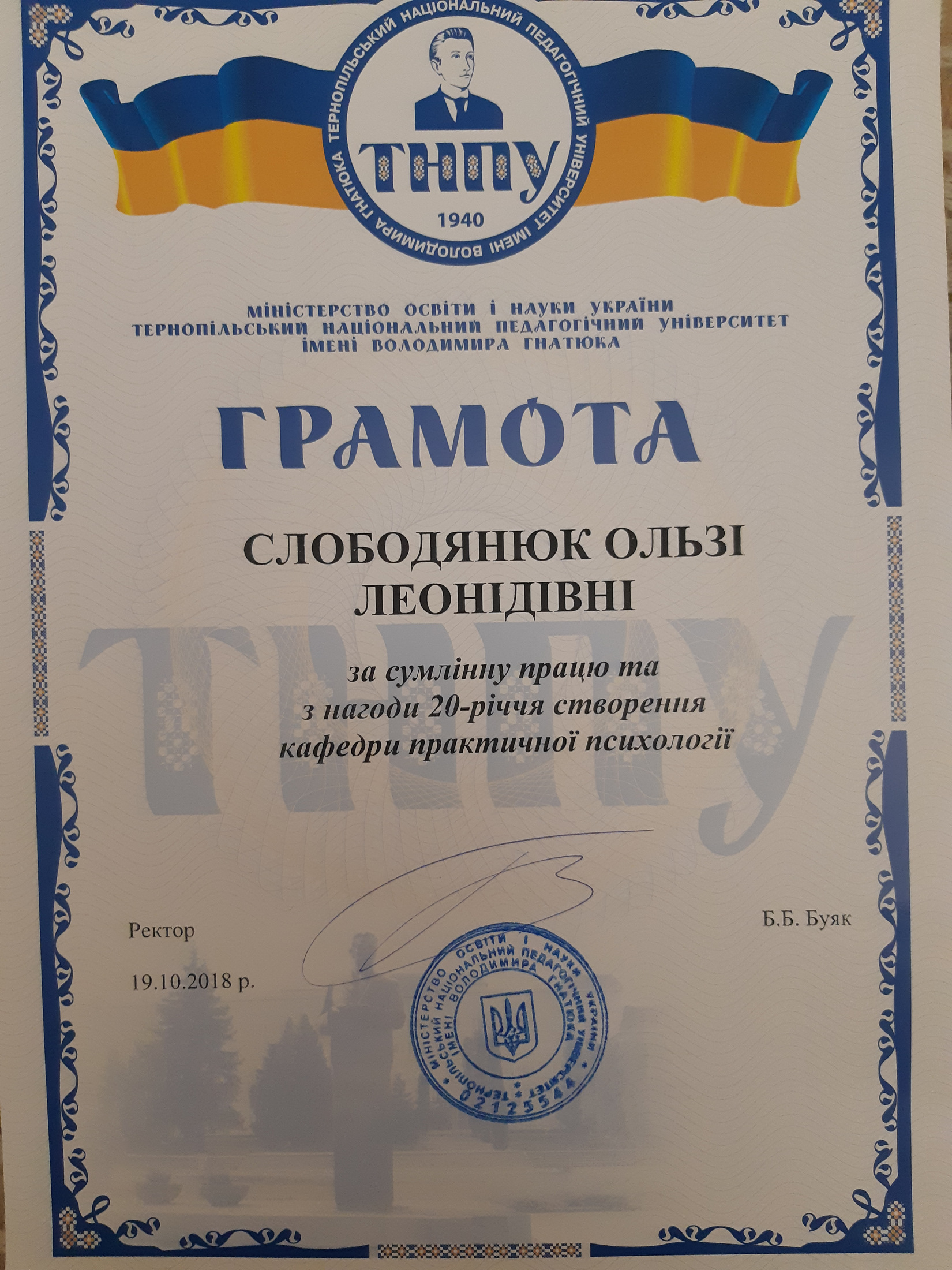 1. Слободянюк О. Діалог в контексті впровадження освітніх інформацій. Психологічне забезпечення інноваційних процесів в освітньо-професійному просторі закладу вищої освіти: сучасні реалії та перспективи: зб. тез доп. всеукр. наук.-практ. конф., м. Кам’янець-Подільський, 6 грудня, 2019 р. Кам’янець-Подільський, 2019. 2. Слободянюк О. Роль соціального інтелекту у професійній підготовці майбутніх педагогів. Методологічні, теоретичні та практичні проблеми психологічної науки: матеріали ІІ міжн. наук. інтернет-конференції, (м. Дрогобич, 25 лютого 2020 р.) Дрогобич, 2020. 3. Слободянюк О. Емпірика розвитку соціального інтелекту педагогів. Eurasian scientific congress: I International Scientific and Practical Conference, (Barcelona, 27-28 January, 2020). Barcelona, 2020. 4. Слободянюк О. Діалогічне навчання в процесі підготовки студентів. «Наука та освіта в дослідженнях молодих учених»: матер.всеукр. наук.-практ. конф.,(14 травня 2020 року Харківський національний педагогічний університеті імені Г. ССковороди). Харків, 2020. |