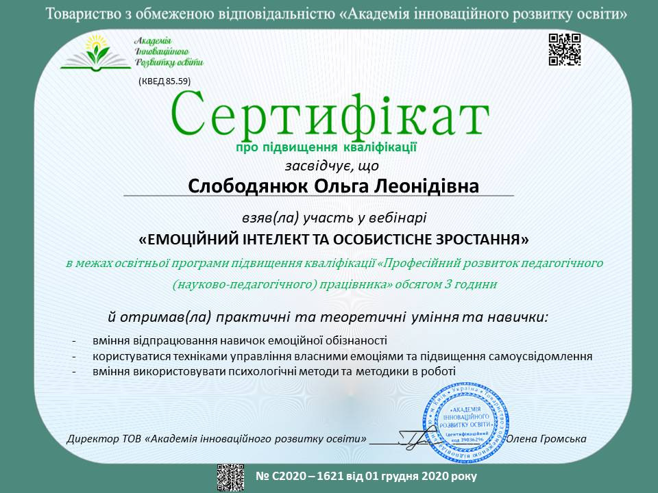 5. Слободянюк О. Л. Проблема співвідношення соціального та емоційного інтелекту у психології. Науковий вісник Херсонського державного університету. Херсон, 2019. №1. С. 181-187. 6 Слободянюк О., Радчук Г. Розвиток соціального інтелекту у студентів – майбутніх педагогів. Психологія: реальність і перспективи: збірник наукових праць. Вип.13 / упоряд. Р.В.Павелків, Н.В.Корчакова. Рівне: РДГУ, 2019. С. 129-136. 7. Слободянюк О. Діалогізація освітнього середовища: витоки і перспективи. Humanitarium: Психологія. ДВНЗ «Переяслав-Хмельницький державний педагогічний університет імені Григорія Сковороди». Ніжин, 2019. Том 43, Вип. 1. Психологія. 8. Слободянюк О. Рефлексивність як інтегрований показник соціального інтелекту (Reflexivity as an integral indicator of social intelligence). Modern engineering and innovative technologies. 2020. Issue 12, Part 4. P.101-107 DOI: 10.30890/2567-5273.2020-12-04-077 |