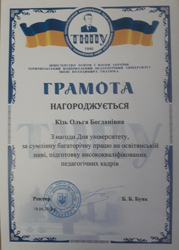 2012 р. – Грамота Тернопільського національного педагогічного університету імені Володимира Гнатюка;