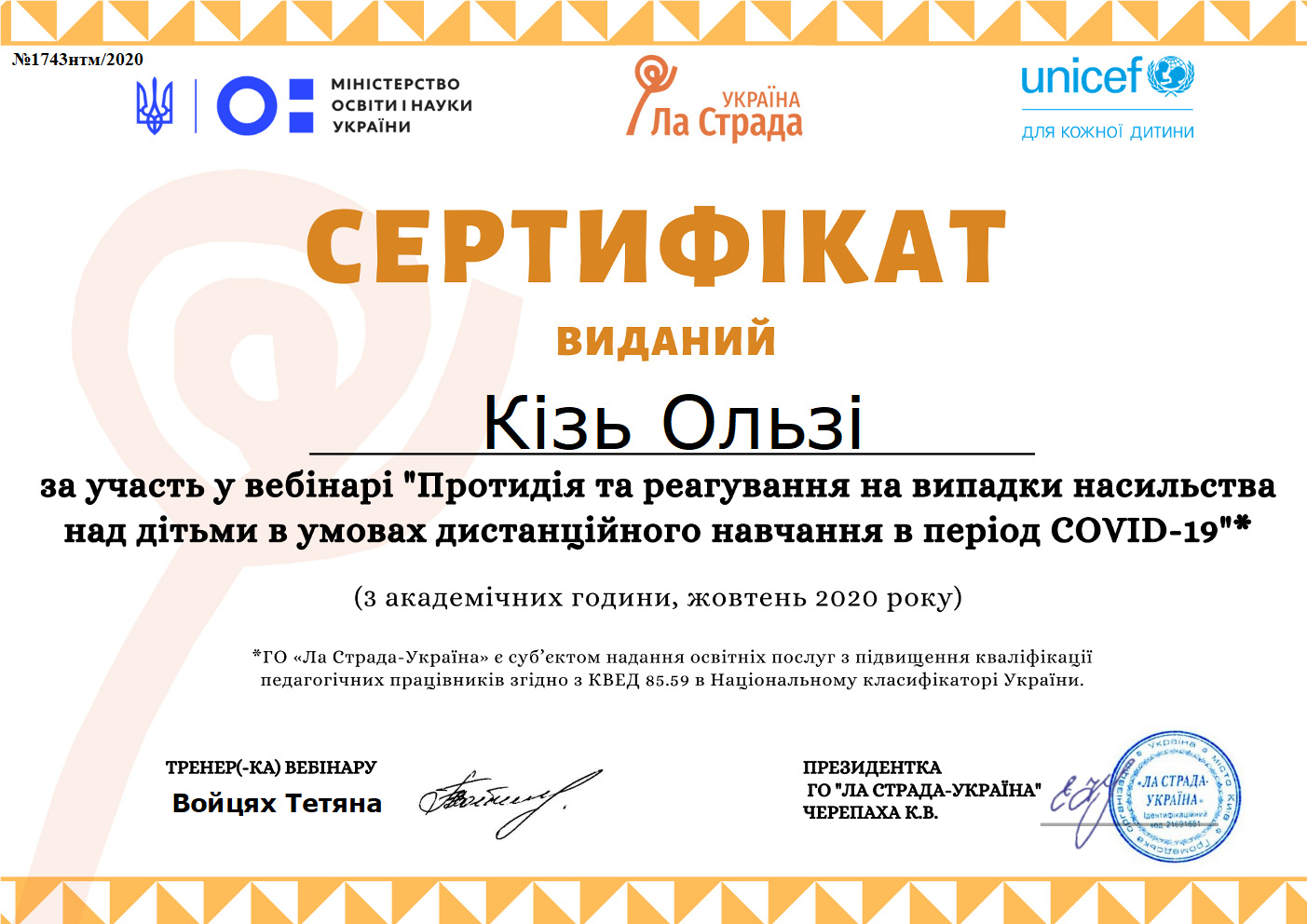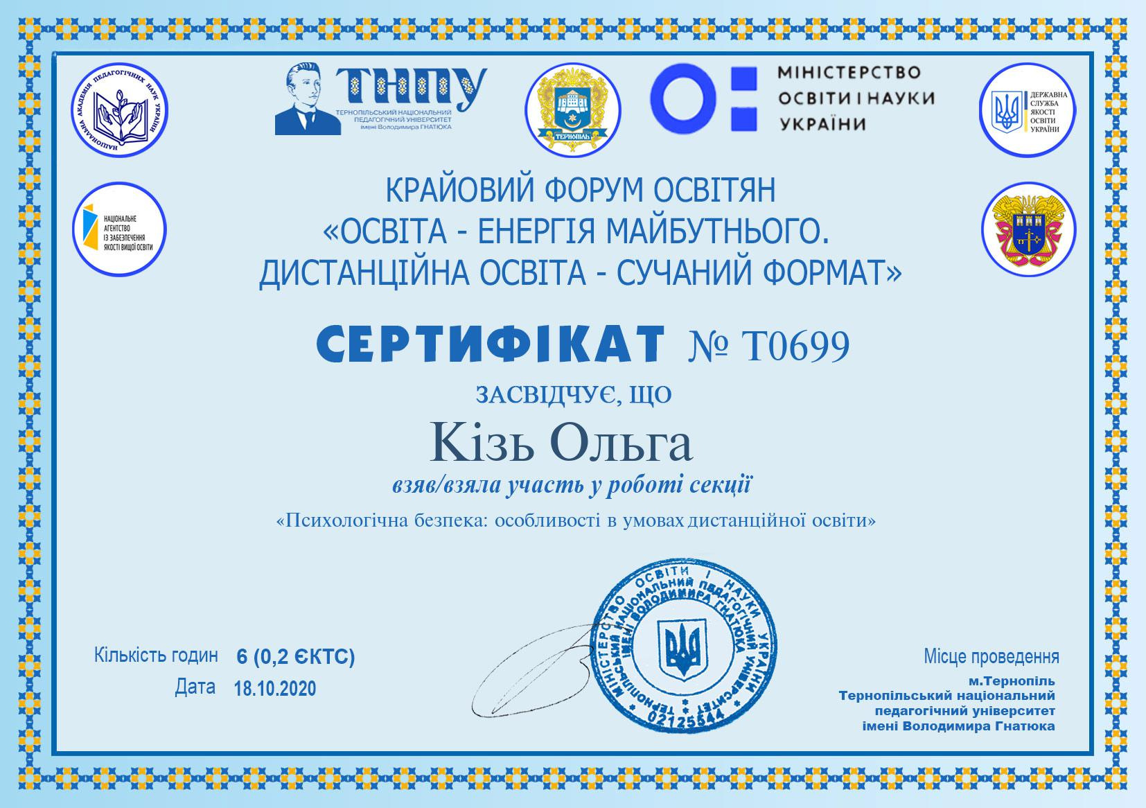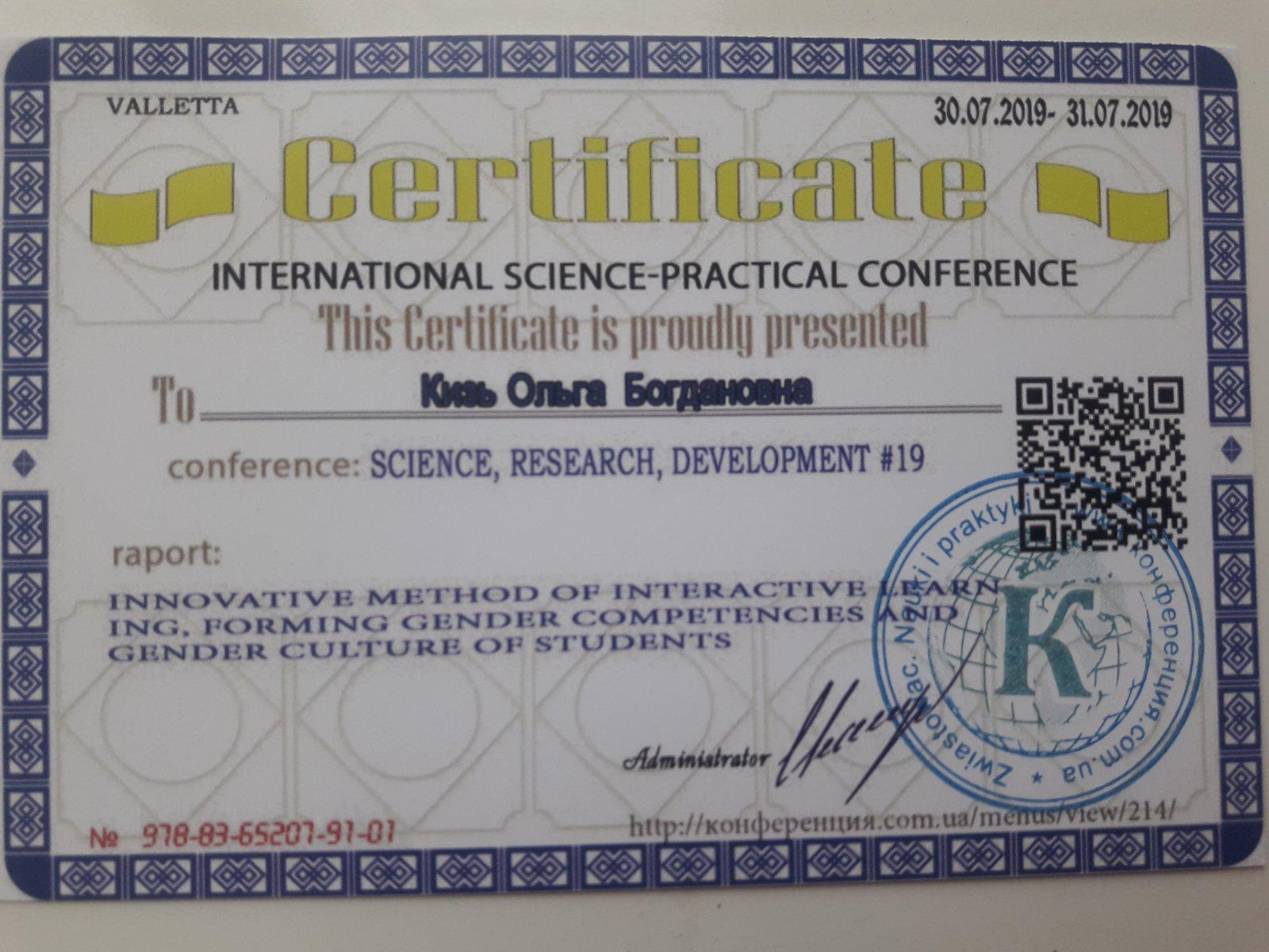 «Гендерна освіта. Гендерна політика. Протидія насильству в сім’ї», МОНМСУ, Державний інститут сімейної та молодіжної політики, вересень 2011р., свідоцтво 12СПК812318