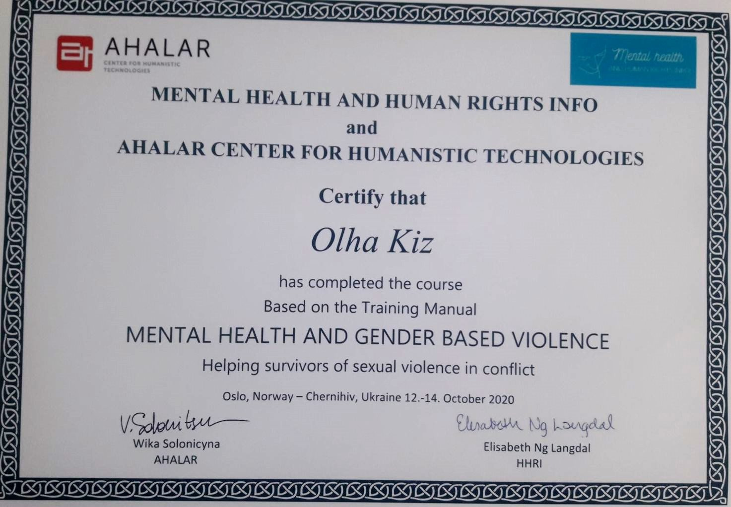 «Програма підготовки тренерів з підвищення гендерної обізнаності та гендерної чутливості», Програми рівних можливостей та прав жінок в Україні (спільний проект Європейського Союзу та Програми розвитку ООН), 2009-2010 р.р..