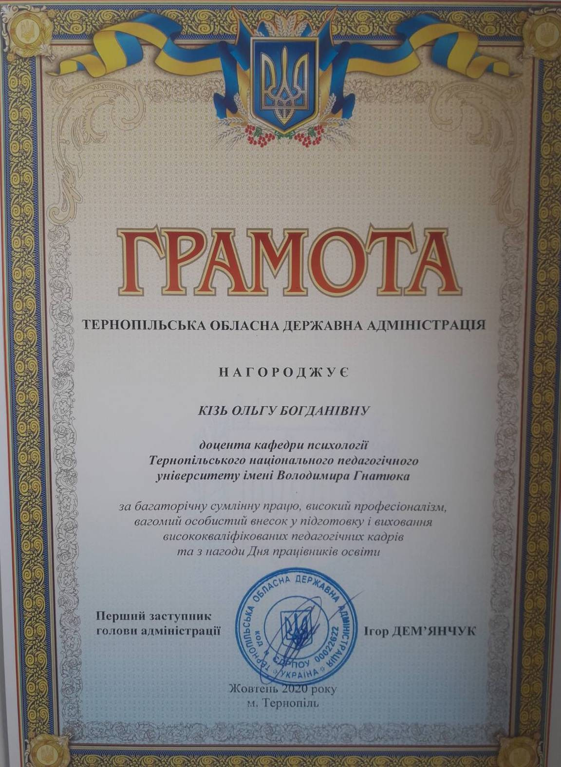 2015 р. – Грамота Департаменту освіти і науки Тернопільської обласної державної адміністрації.