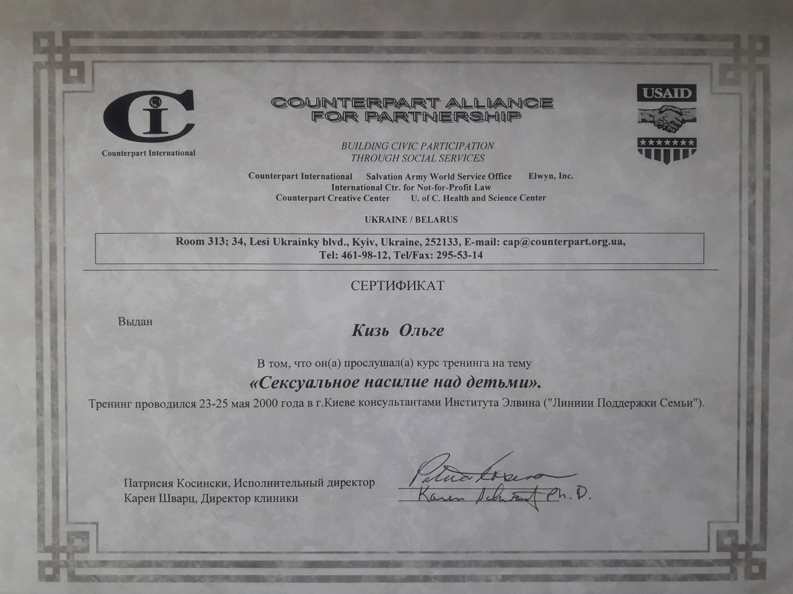 Тренінговий курс «Сексуальне насилля над дітьми» Інститут Елвіна, США, «Лінія підтримки сім’ї», м.Київ, 2000 р.
