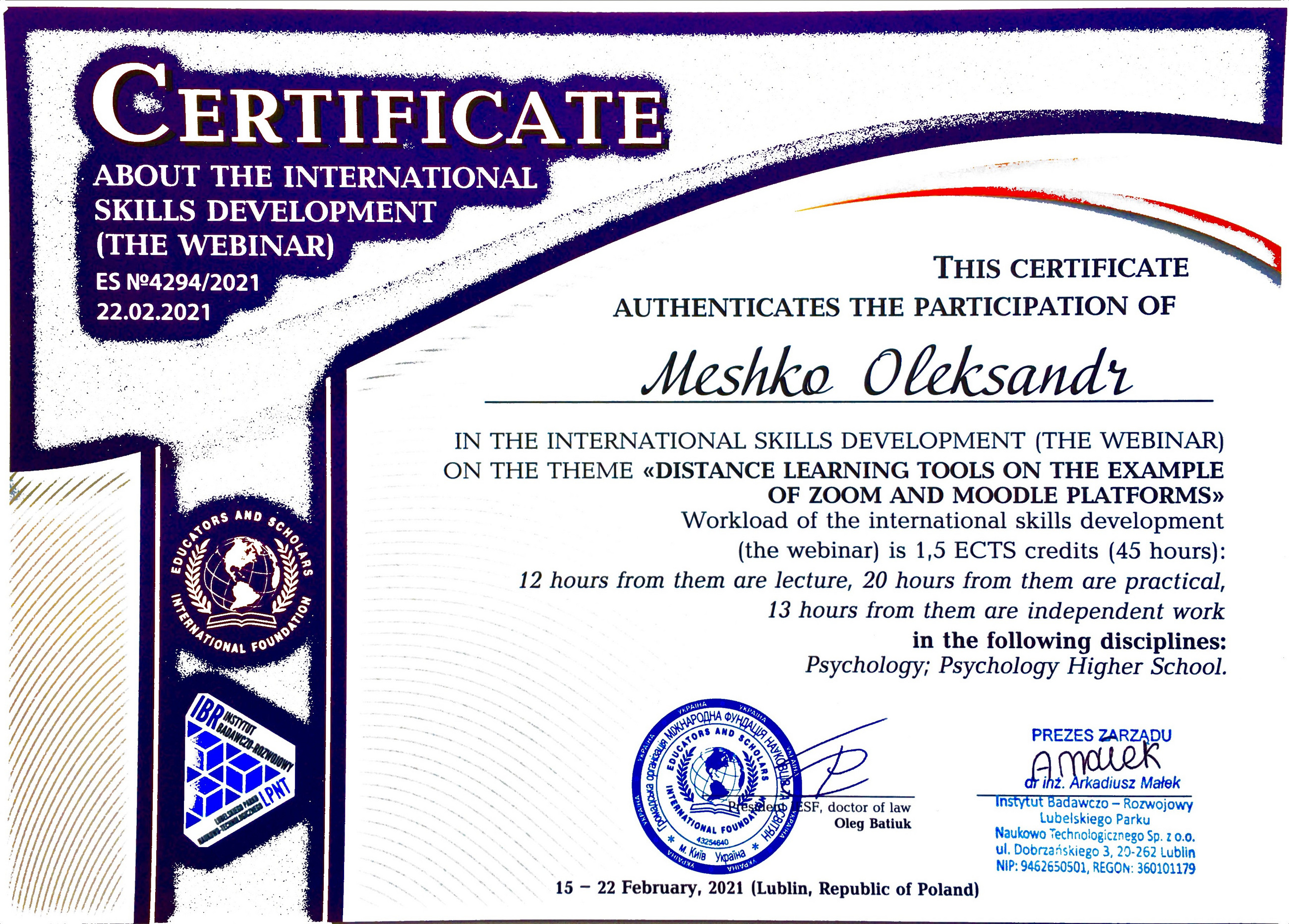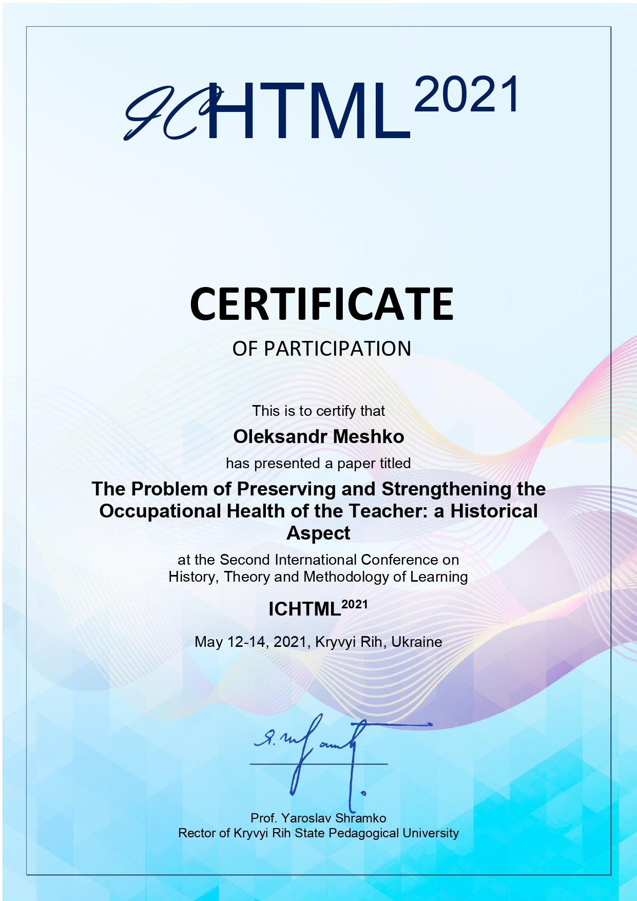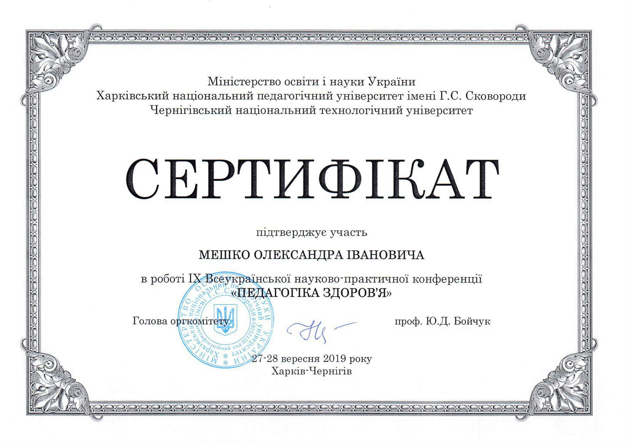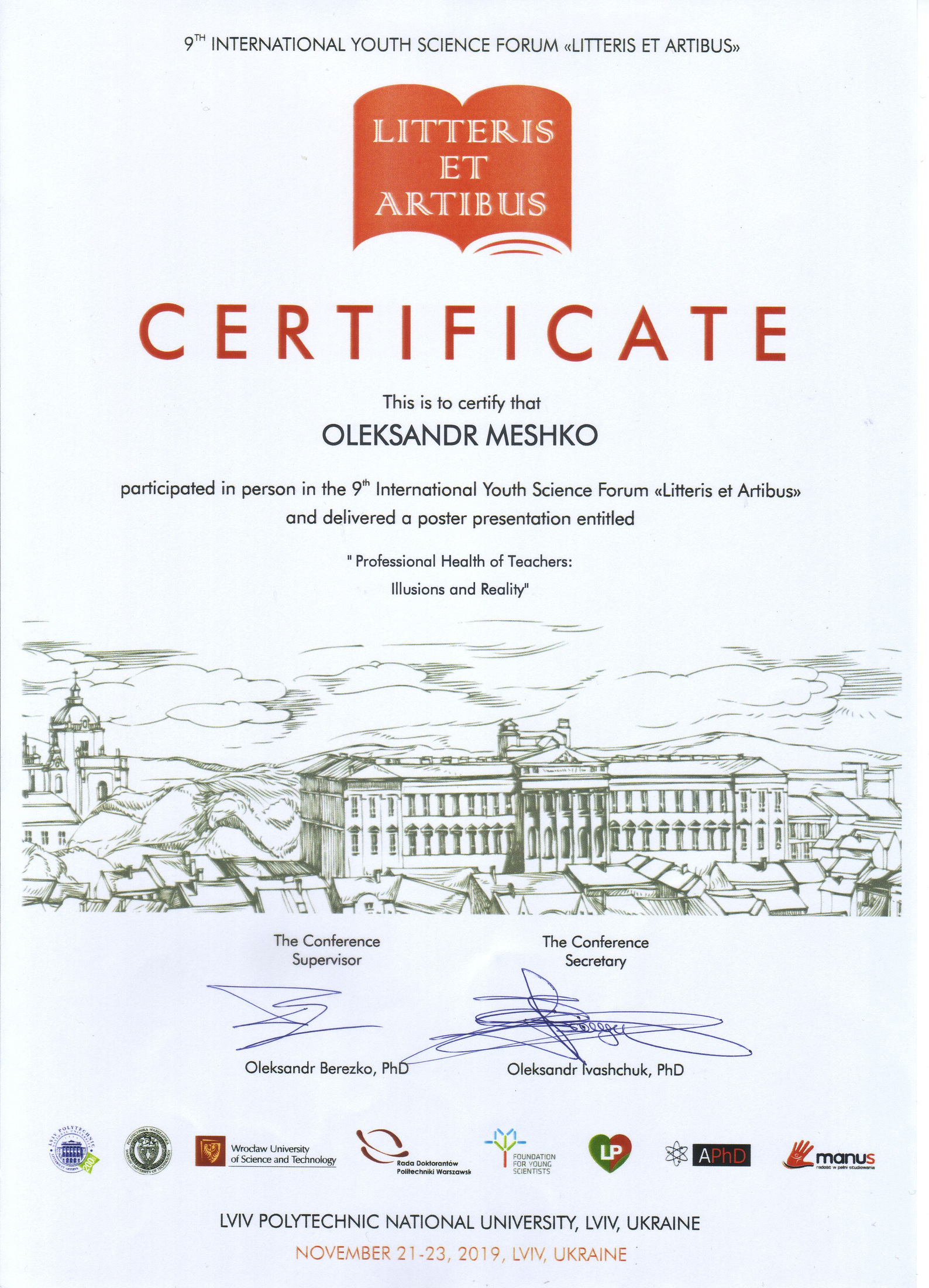 11. Preparation of the future teachers for strengthening and maintaining professional health / H. Meshko, O. Meshko // Development and modernization of pedagogical and psychological sciences: experience of Poland and prospects of Ukraine : Collective monograph. – Vol. 2. – Lublin : Izdevnieciba «Baltija Publishing», 2017. – P. 206–223.