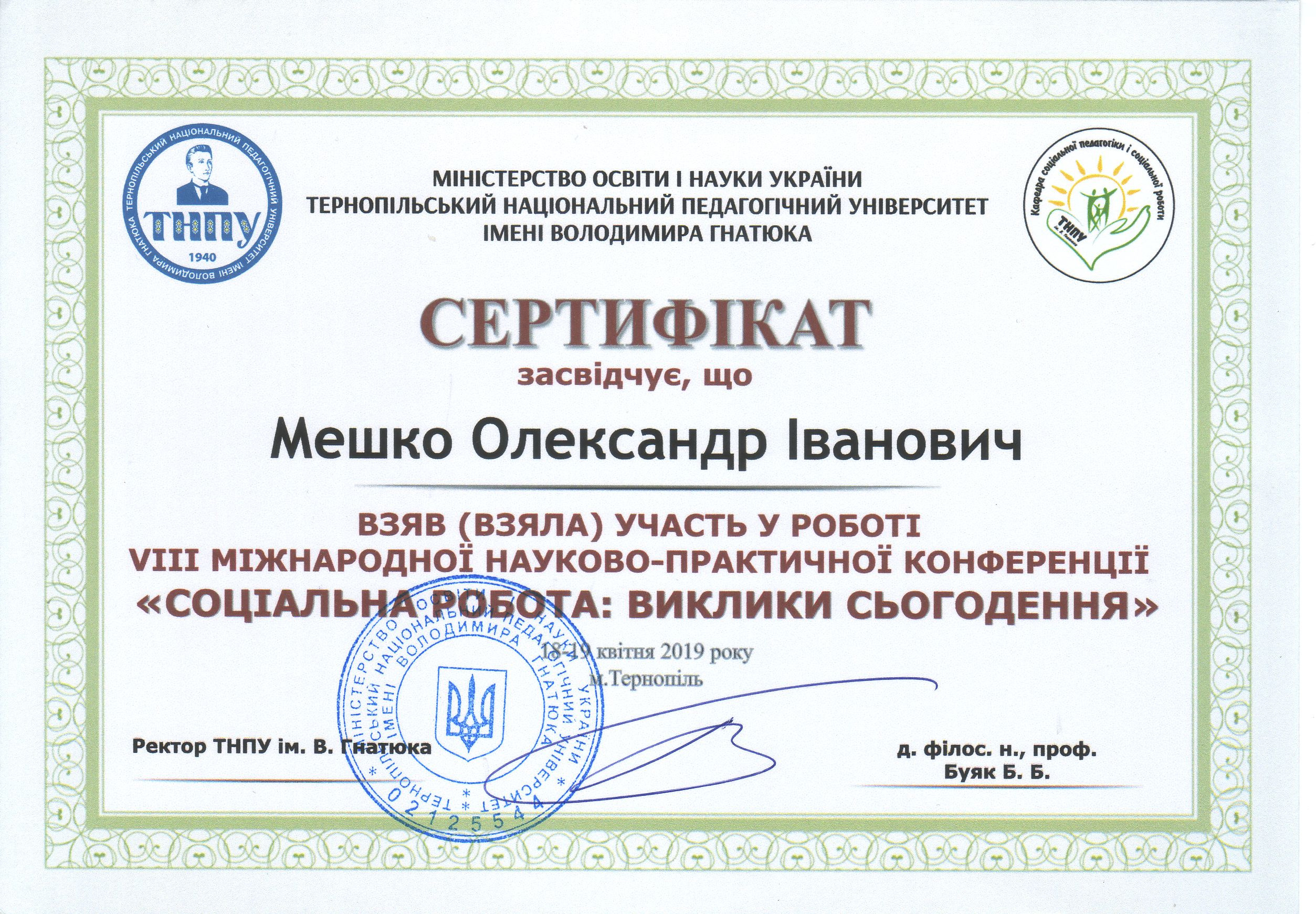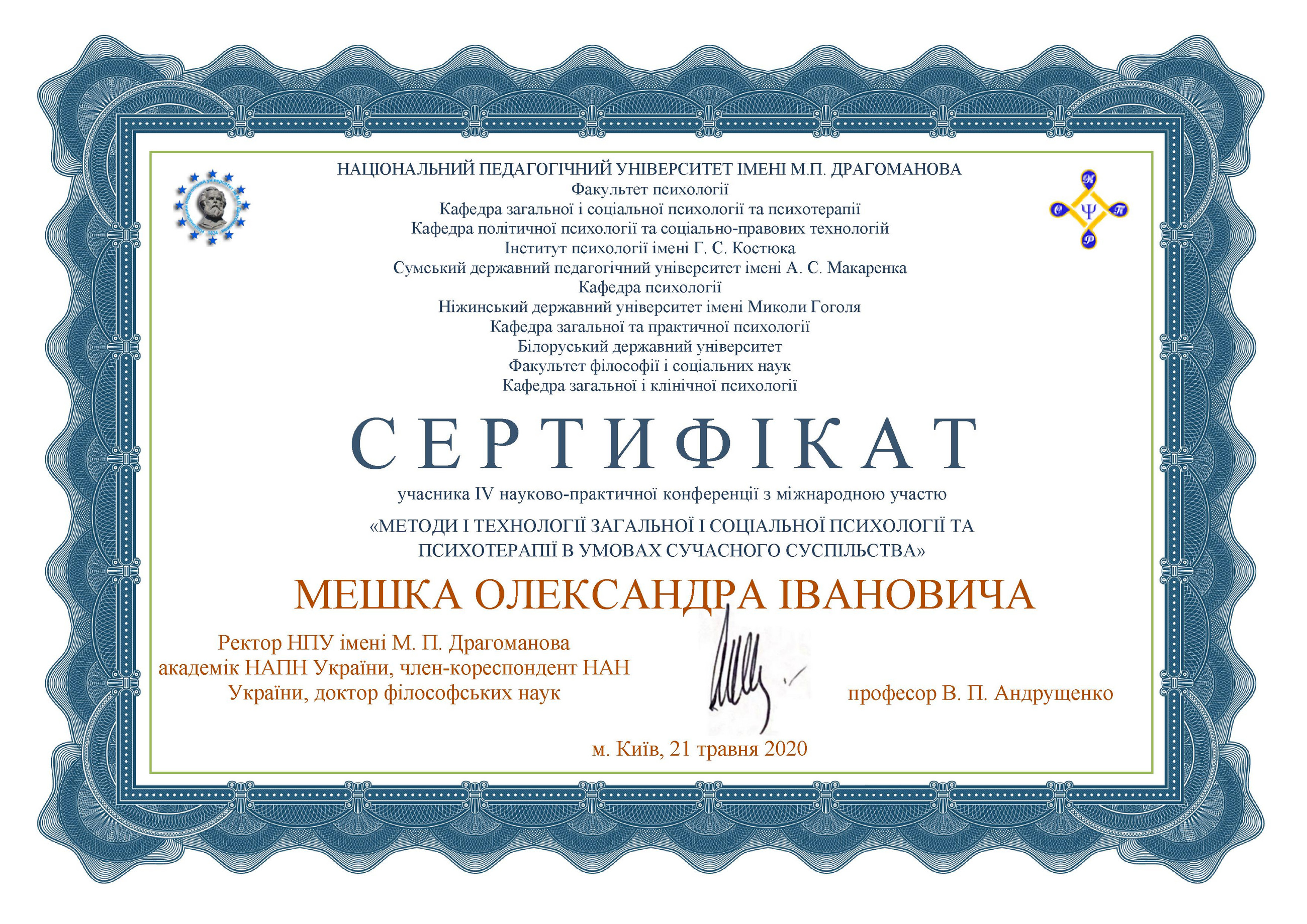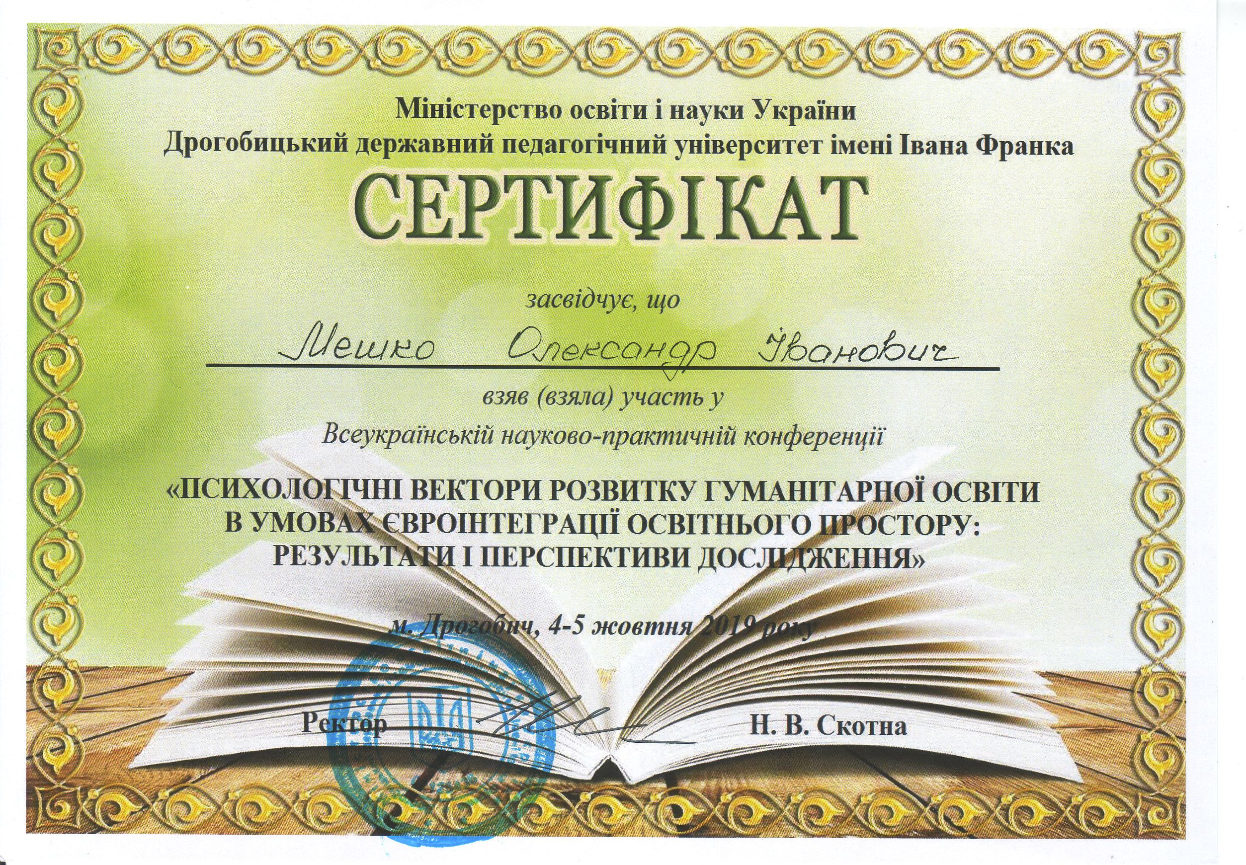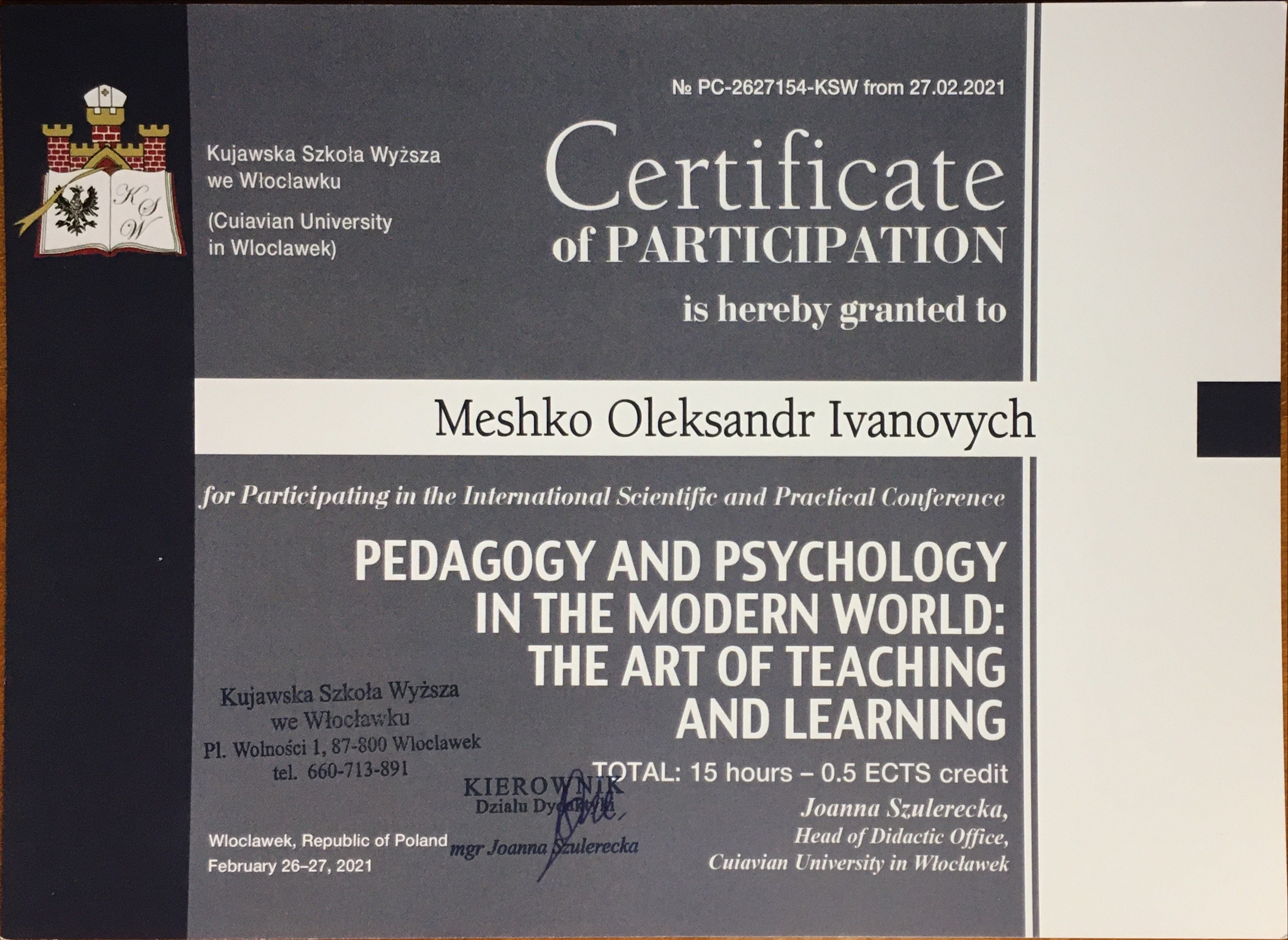 8. Formation of psychotherapeutic position of the future teacher in the coordinates of harmonization his personality / Halyna Meshko, Oleksandr Meshko // Proceedings of the VI International Academic Congress «Fundamental and Applied Studies in EU and CIS Countries» (United Kingdom, Cambridge, England, 24–26 May, 2016). – Volume VI. – «Cambridge University Press», 2016. – P. 361–367.
