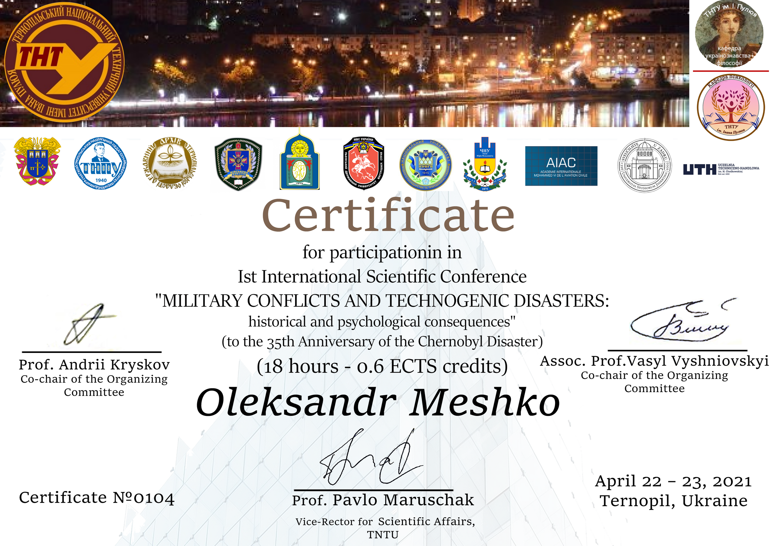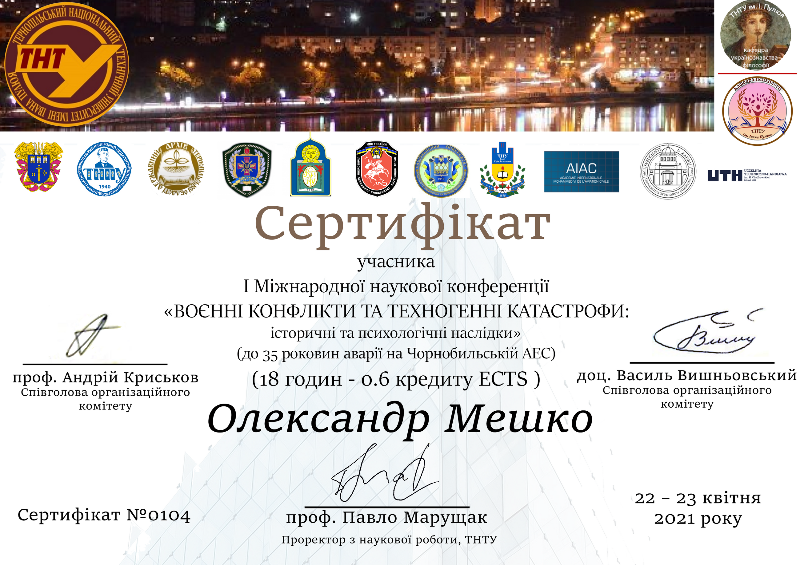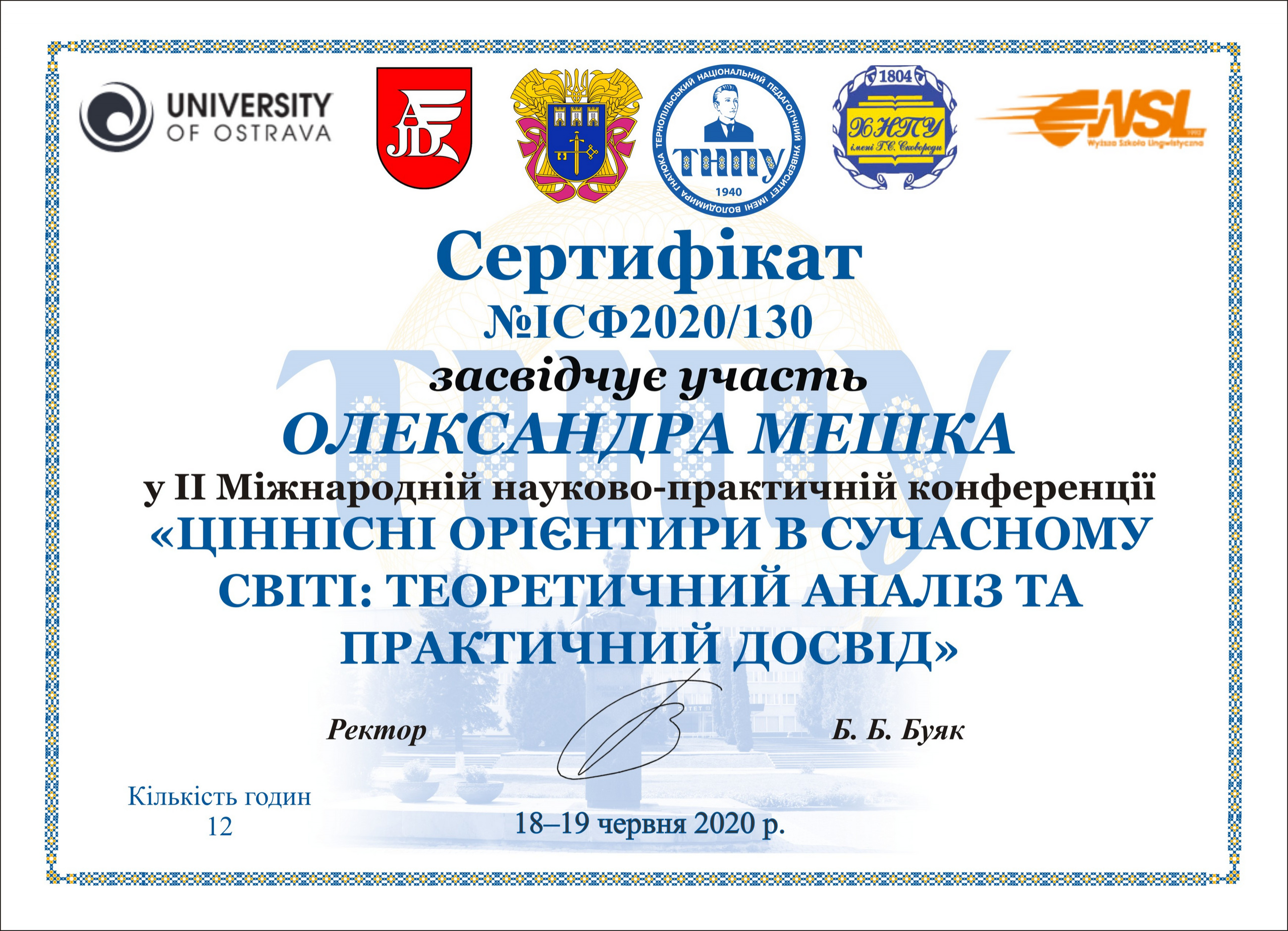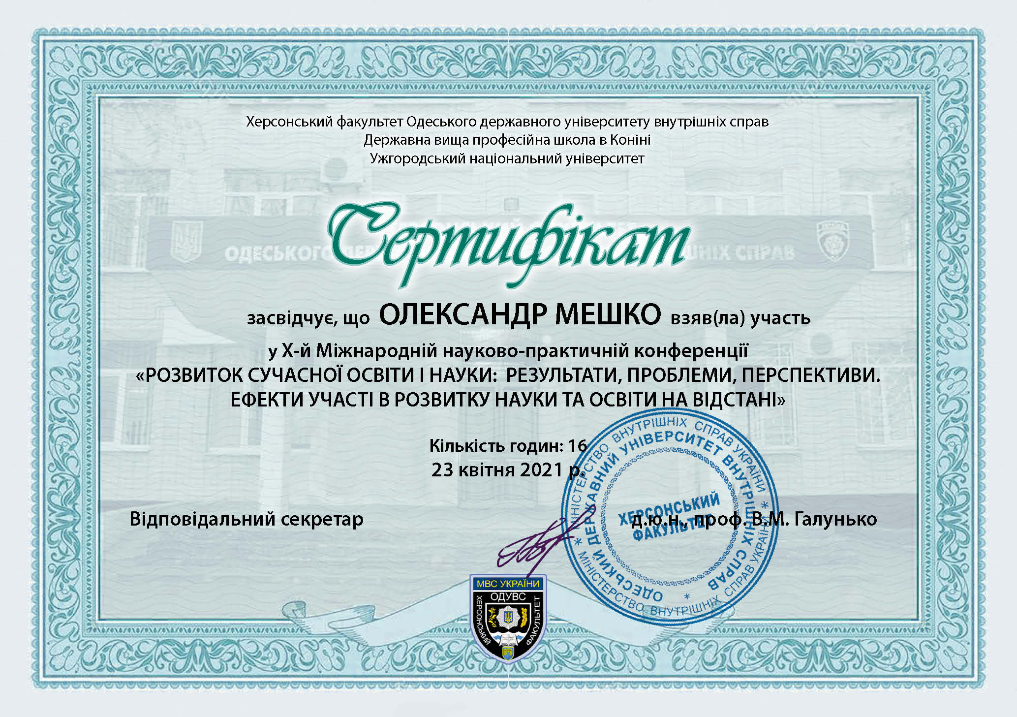 8. Formation of psychotherapeutic position of the future teacher in the coordinates of harmonization his personality / Halyna Meshko, Oleksandr Meshko // Proceedings of the VI International Academic Congress «Fundamental and Applied Studies in EU and CIS Countries» (United Kingdom, Cambridge, England, 24–26 May, 2016). – Volume VI. – «Cambridge University Press», 2016. – P. 361–367.
