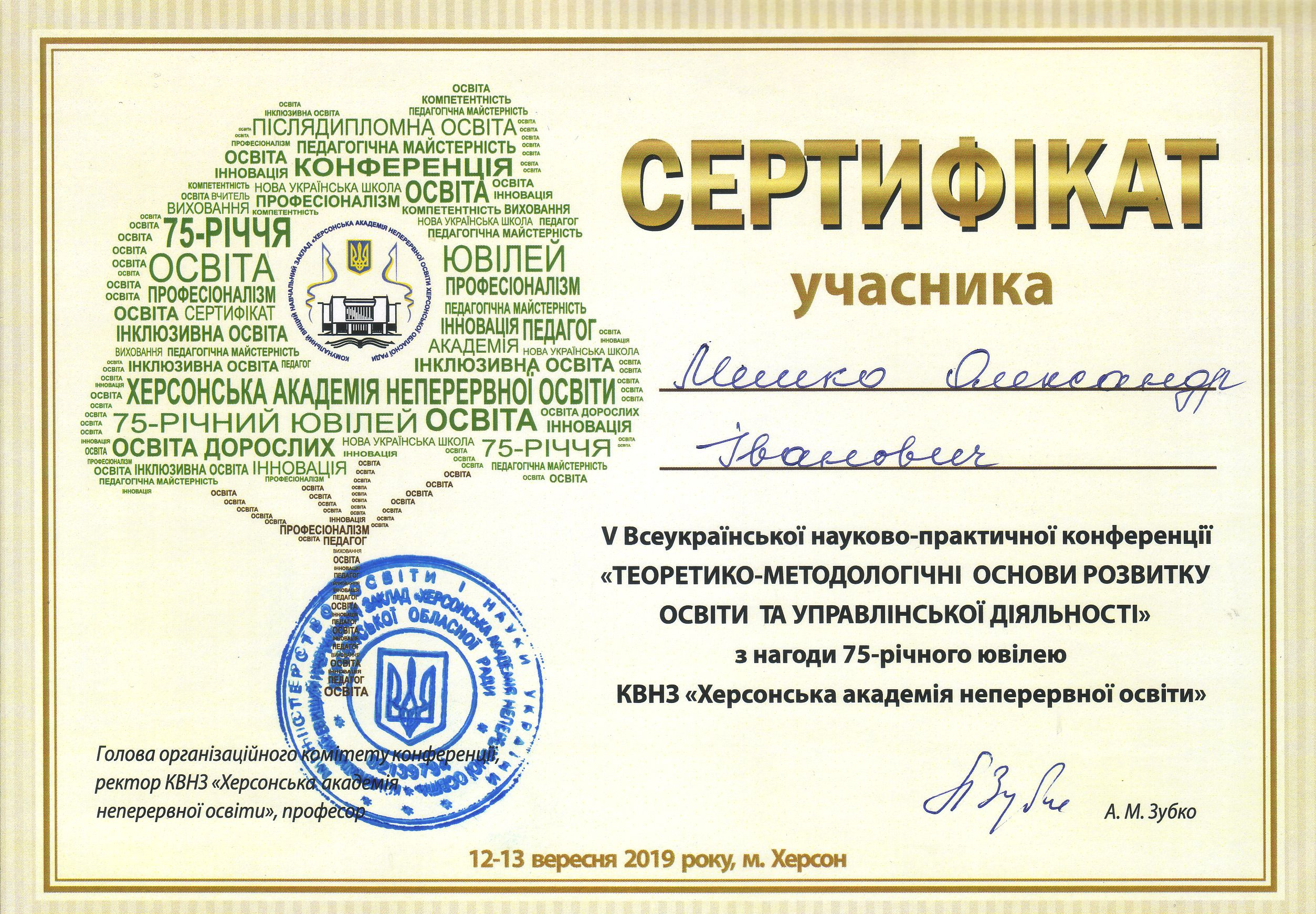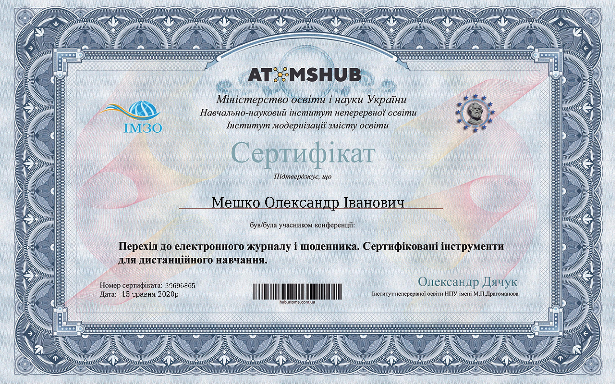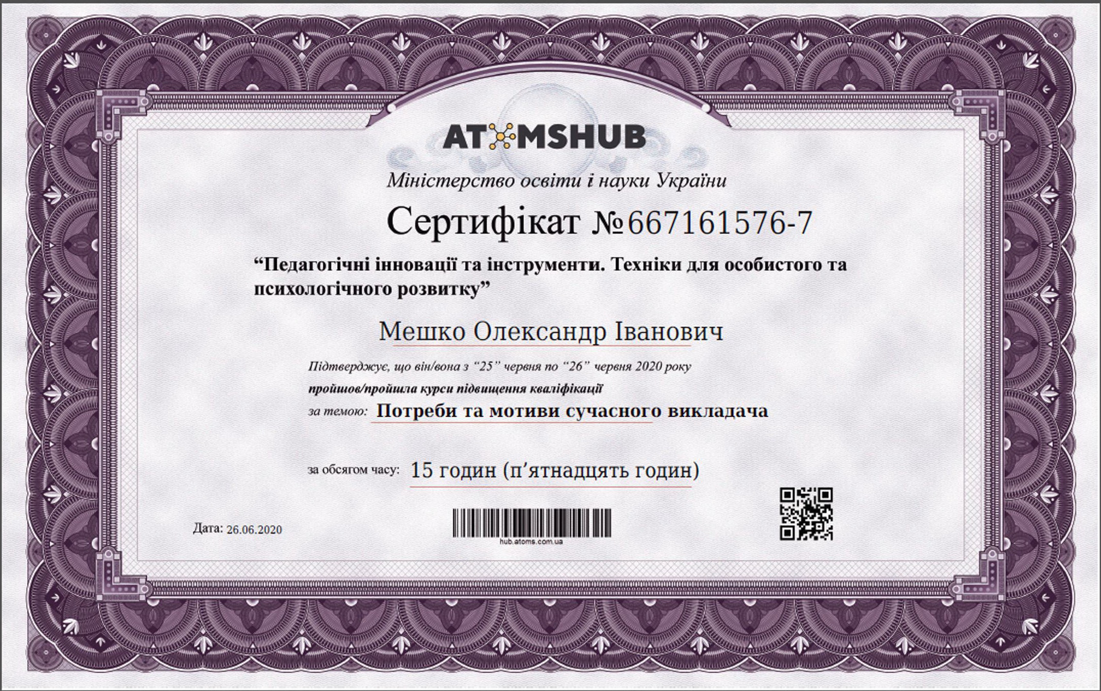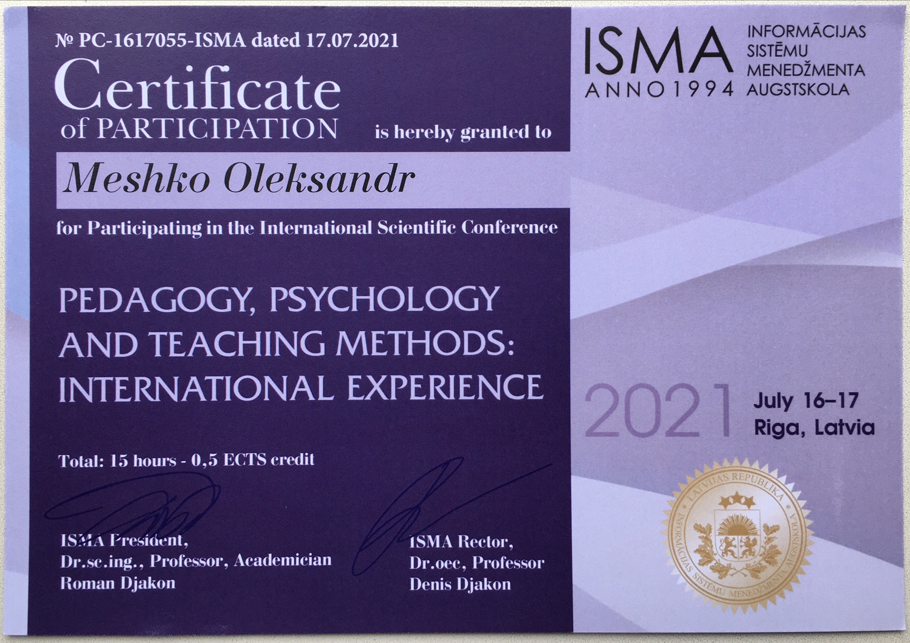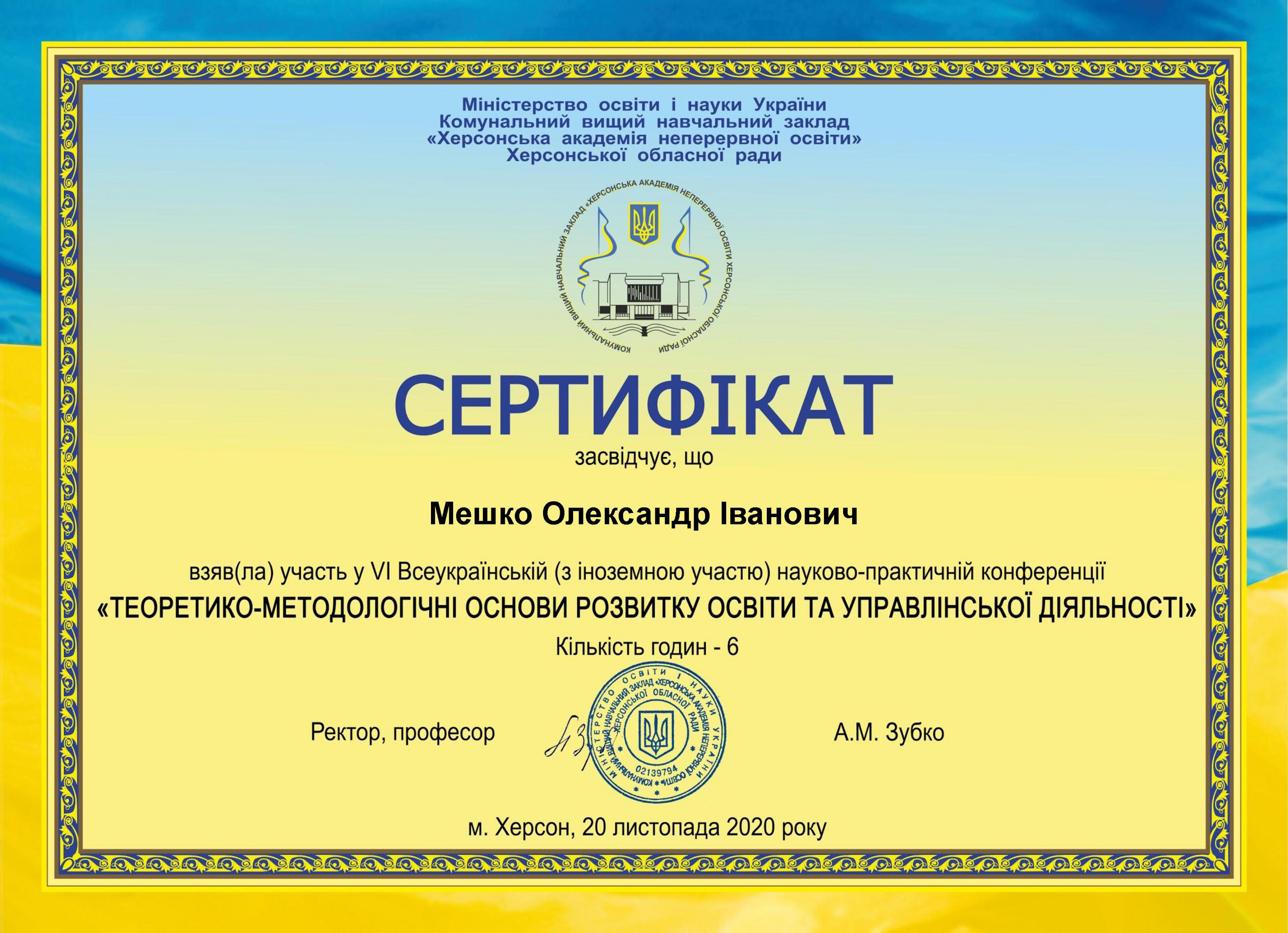 3. The formation of teacher’s professional position as a necessary condition for implementation of the European standards in the system of education of Ukraine / Oleksandr I. Meshko // Středoevropský věstník pro vědu a výzkum (Central European Journal for Science and Research). Série: Pedagogika, Psychologie a Sociologie / Šéfredaktor prof. PhDr. Zdeněk Ondřejek, DrSc. – Praha : Publishing house Education and Science, 2014. – Nr 6 (8). – P. 76–81.
