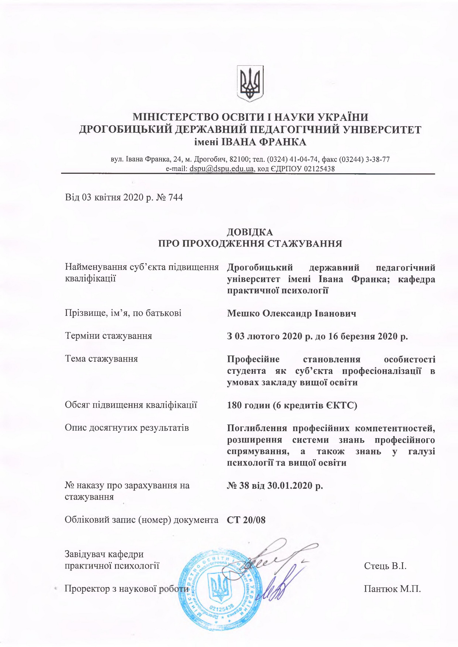 2016 рік, в Дрогобицькому державному педагогічному університеті імені Івана Франка на кафедрі практичної психології, тема стажування: «Розвиток особистості студента як суб’єкта професіоналізації в умовах вищого навчального закладу».