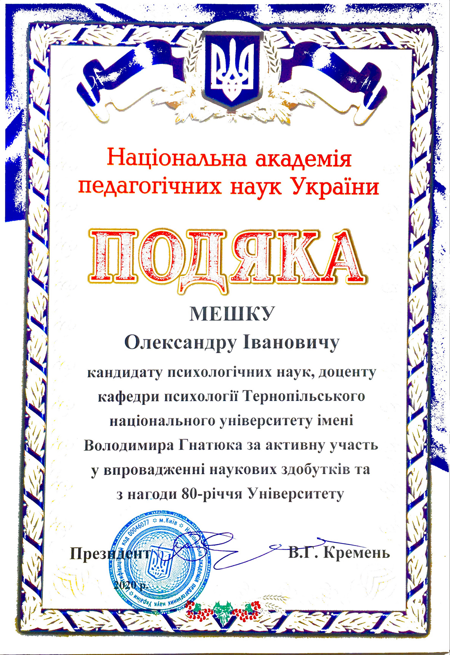 5. Формування психотерапевтичної позиції майбутнього вчителя як основи реалізації валеологічних технологій педагогічної взаємодії / Г.М. Мешко, О.І. Мешко // Науковий вісник Ужгородського університету : Збірник наукових праць. Серія «Педагогіка. Соціальна робота» / гол. ред. І.В. Козубовська. – Ужгород, 2015. – Випуск 37. –С. 113–116.