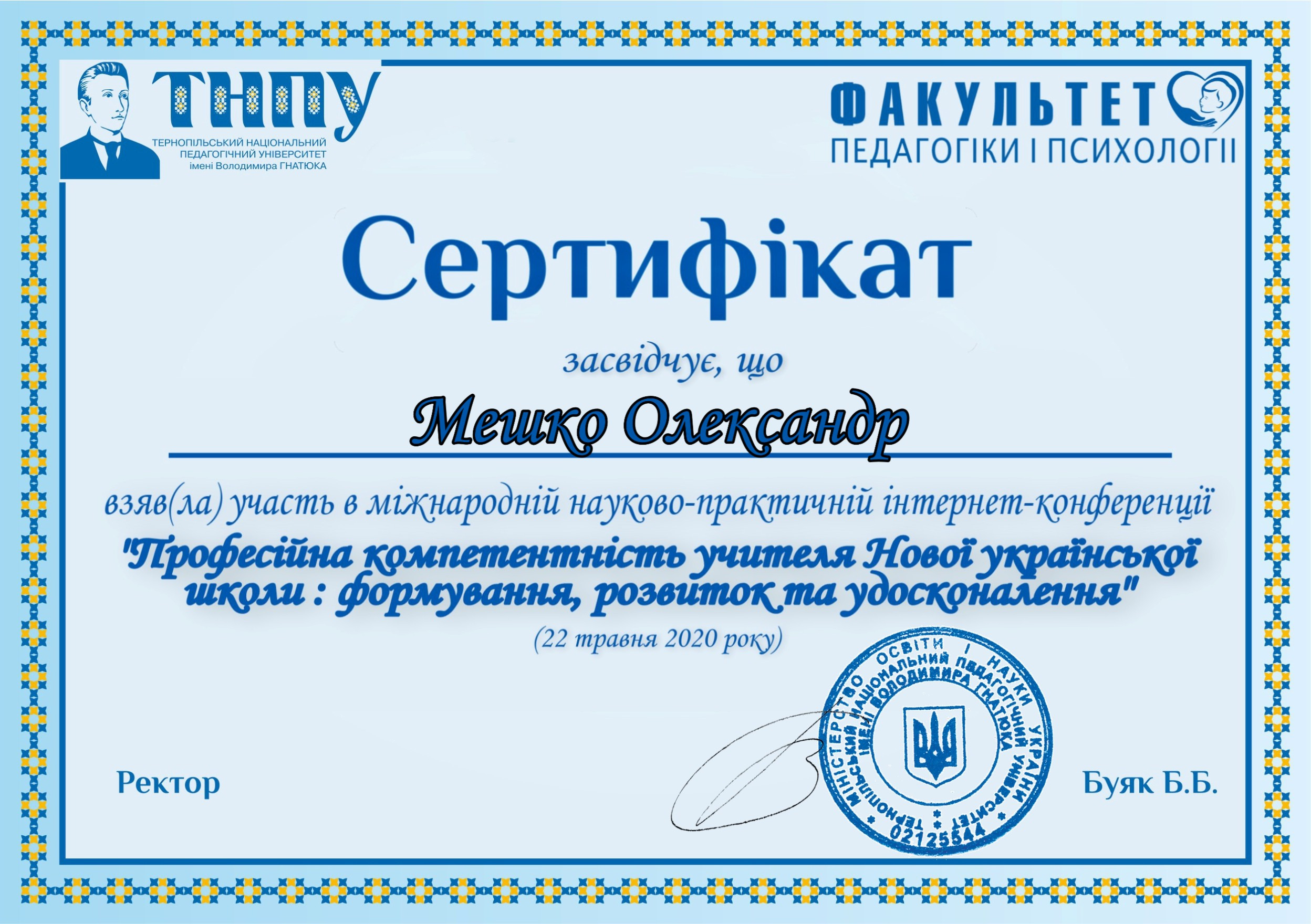 10. Формування психологічно безпечного освітнього середовища у загальноосвітньому навчальному закладі / Г.М. Мешко, О.І. Мешко // Гуманітарний вісник ДВНЗ «Переяслав-Хмельницький державний педагогічний університет імені Григорія Сковороди». – Вип. 37 (3). Том II (22) : тематичний випуск «Міжнародні Челпанівські психолого-педагогічні читання» / відп. ред. випуску І.П. Маноха. – К. : Гнозис, 2017. – С. 62–70.