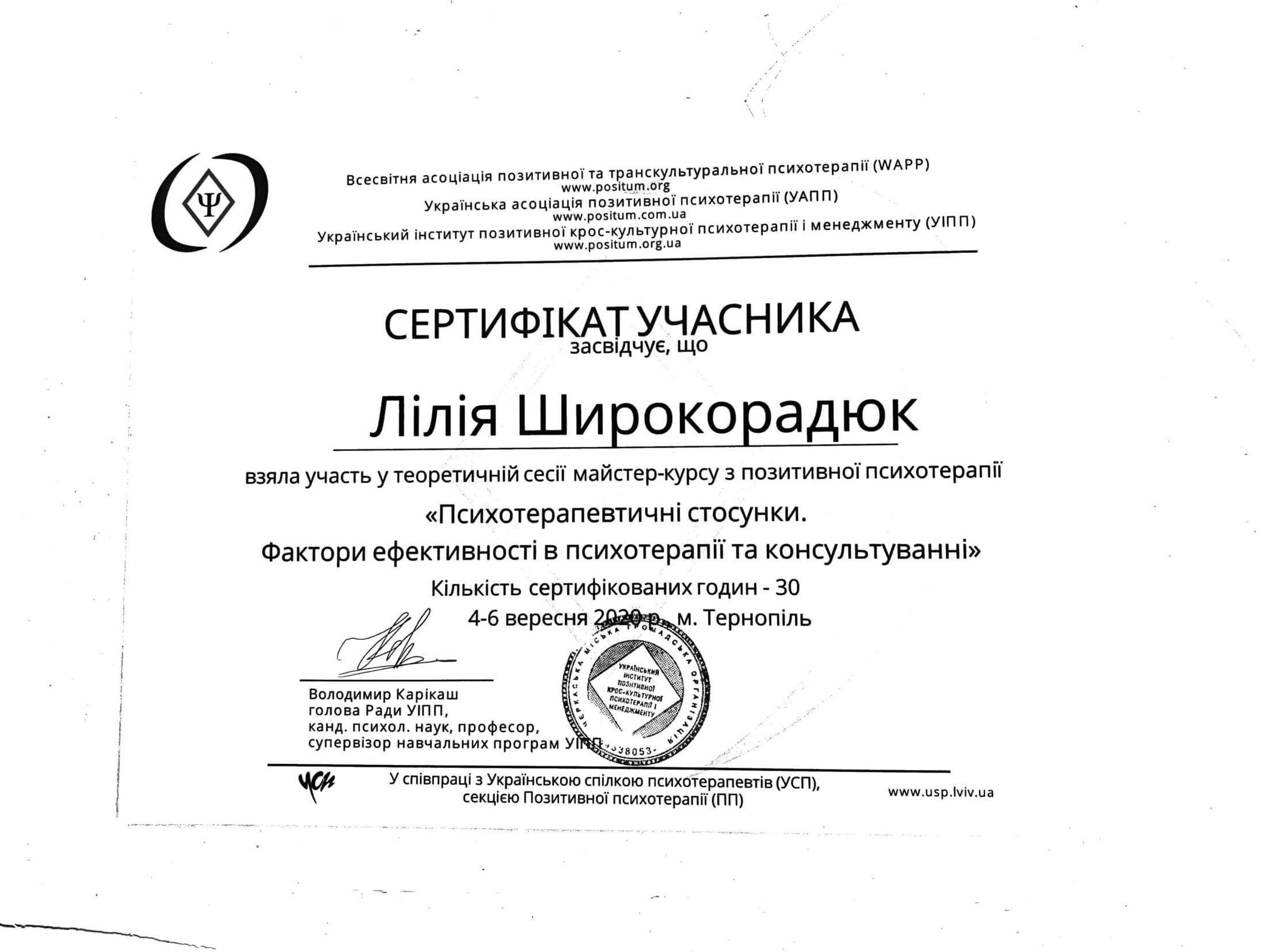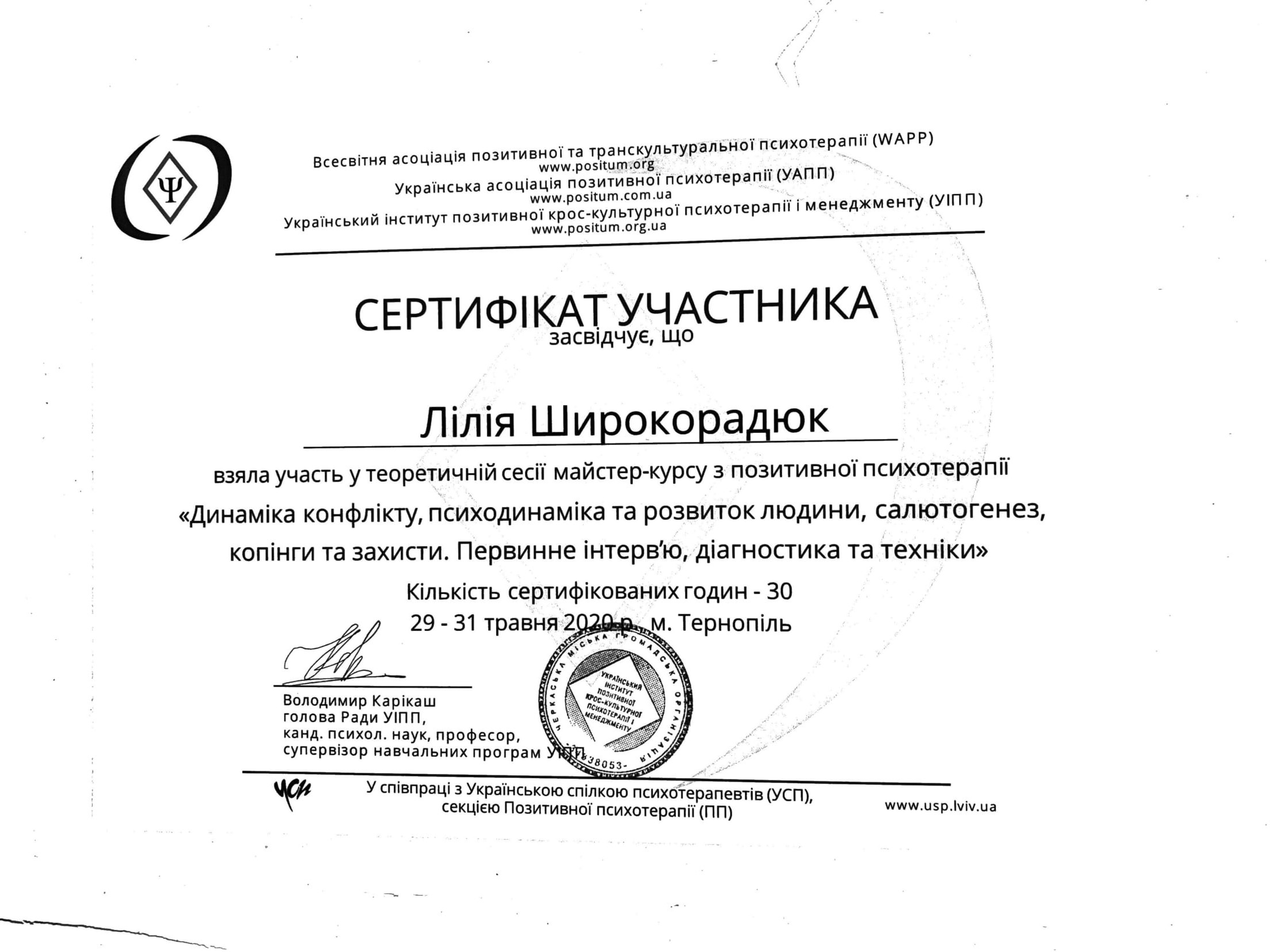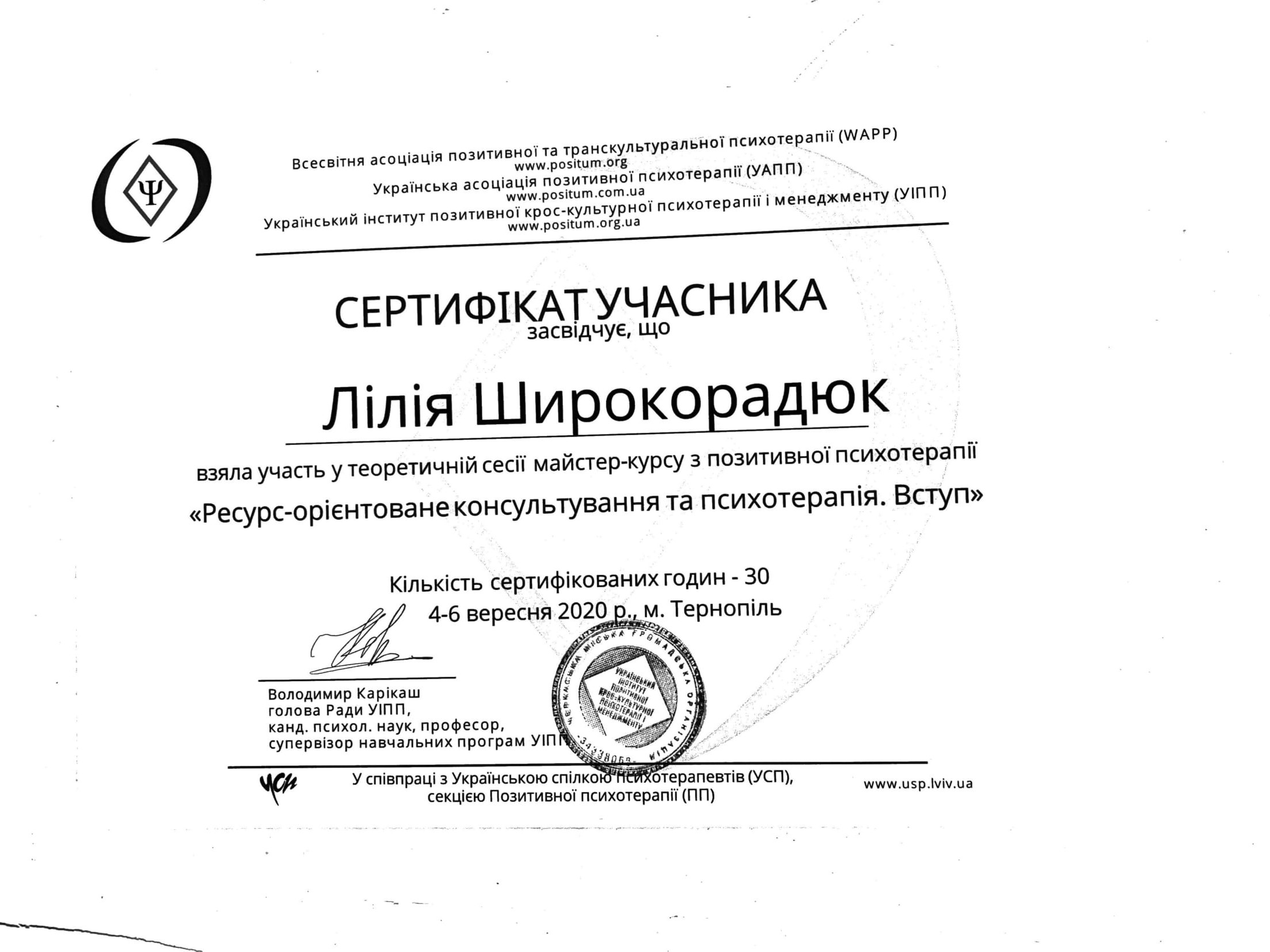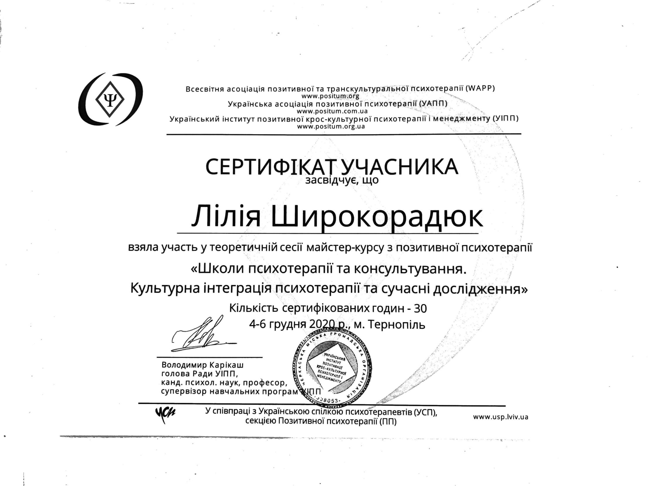 У 2017 році отримала сертифікат міжнародного рівня «Basic Consultant of Positive Psychotherapy» від World Association for Positive and Transcultural Psychotherapy та є практикуючим психологом – психотерапевтом у методі позитивної психотерапії.