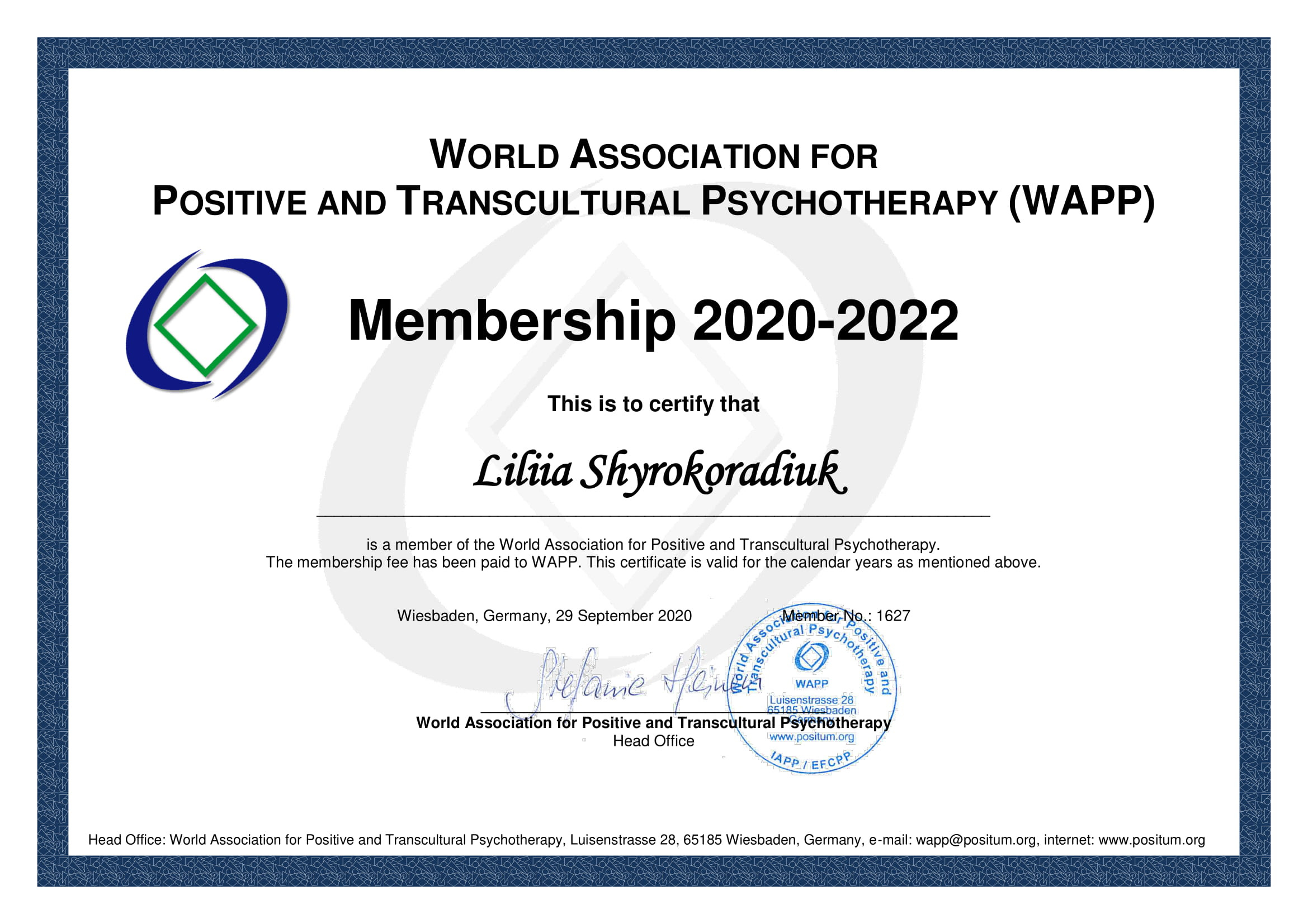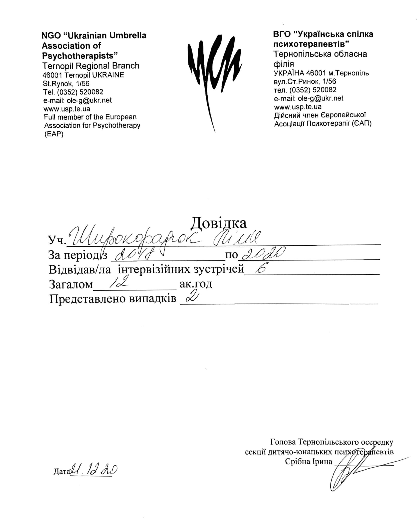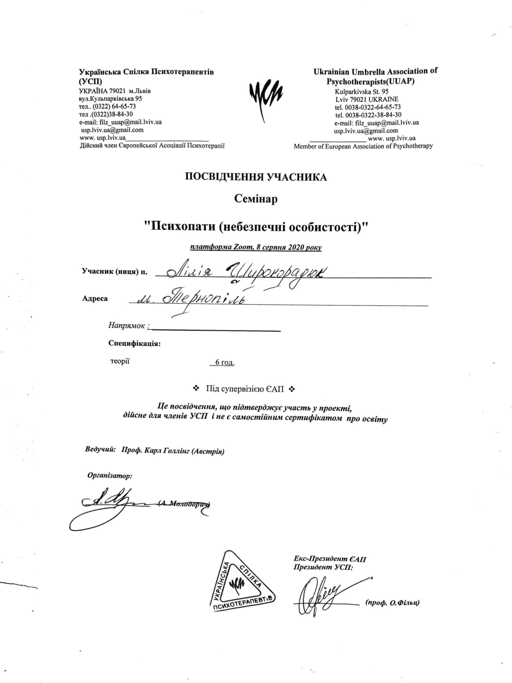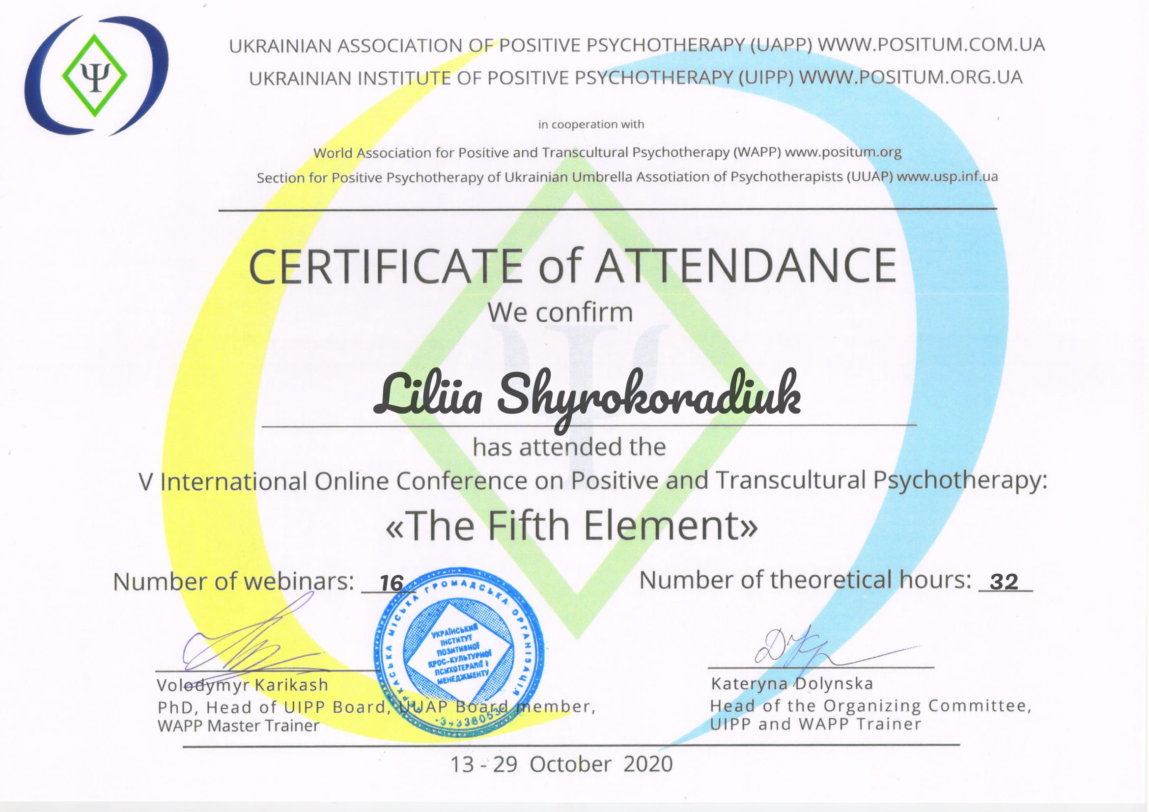 У 2017 році отримала сертифікат міжнародного рівня «Basic Consultant of Positive Psychotherapy» від World Association for Positive and Transcultural Psychotherapy та є практикуючим психологом – психотерапевтом у методі позитивної психотерапії.