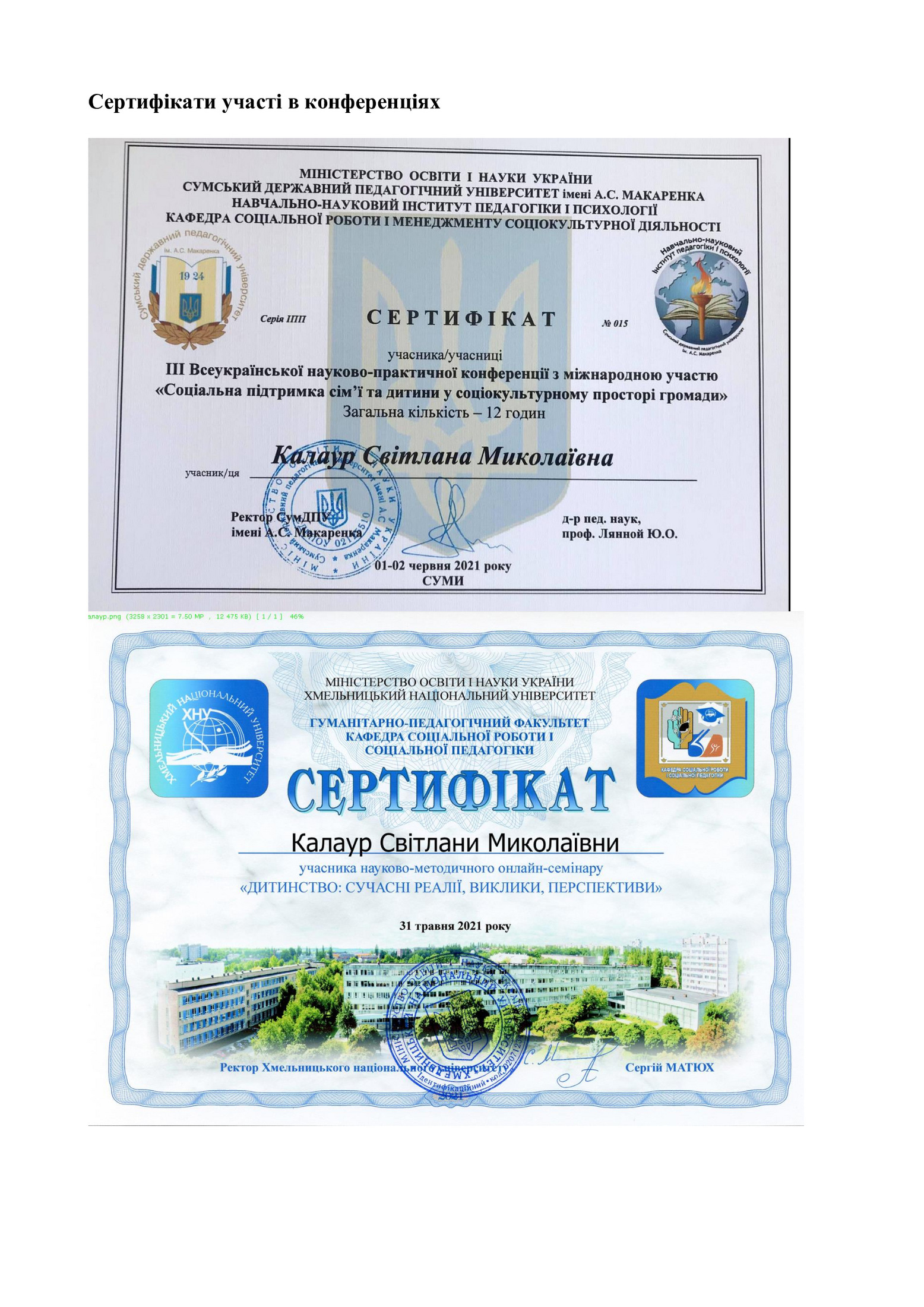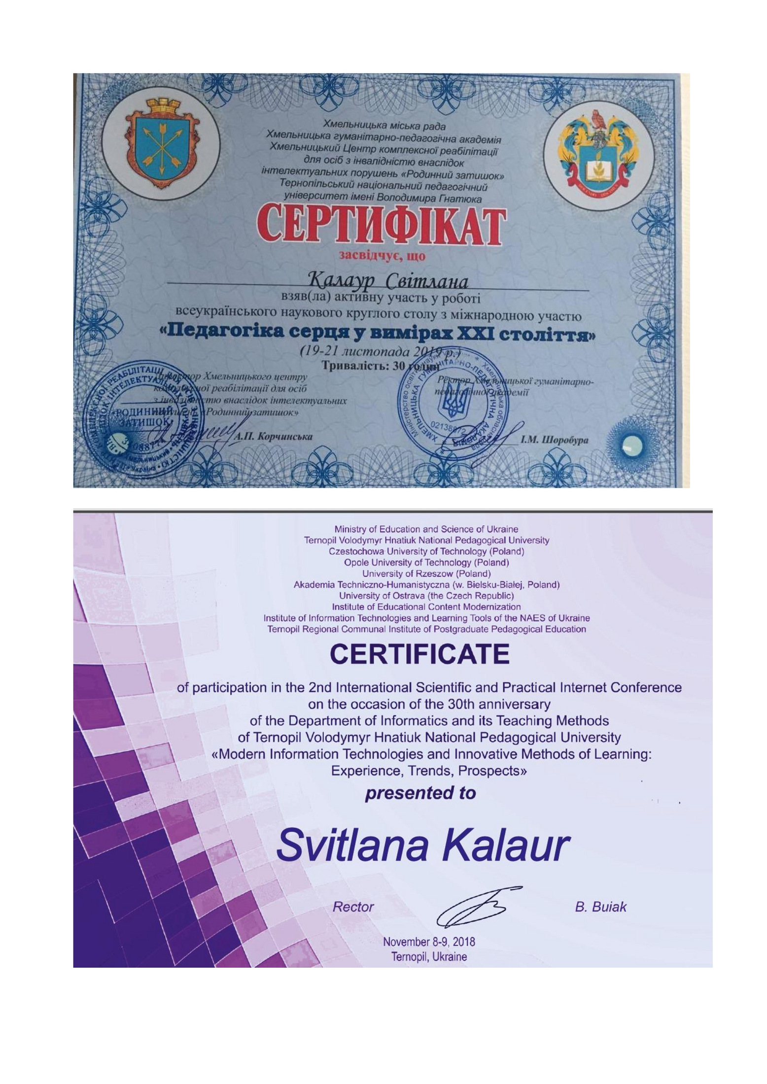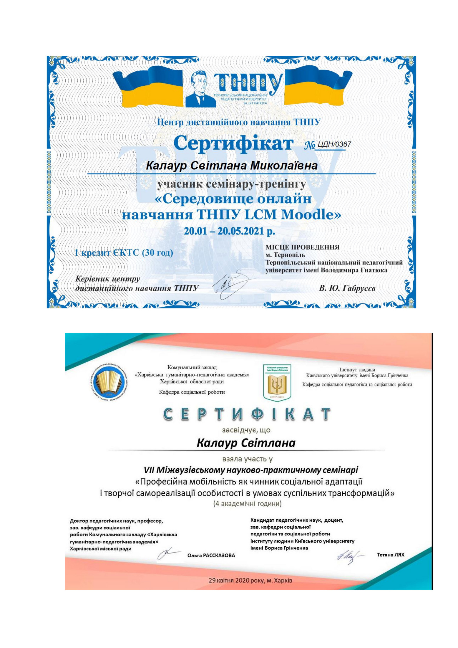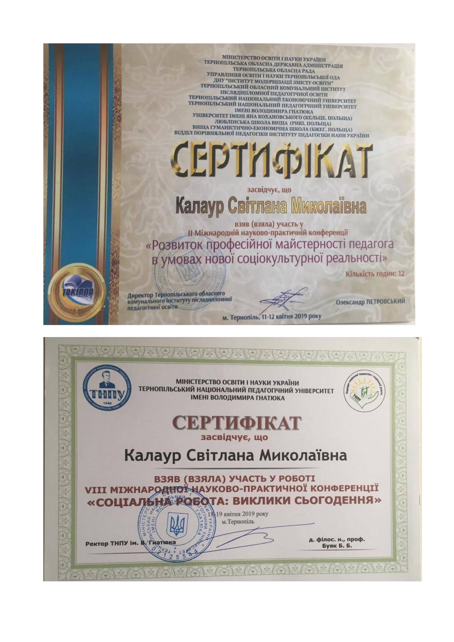 - Калаур С.М. Теорія і методика професійної підготовки майбутніх фахівців соціальної сфери до розв’язання конфліктів у професійній діяльності : монографія. – Тернопіль : Осадца Ю.В., 2018. – 456 с.