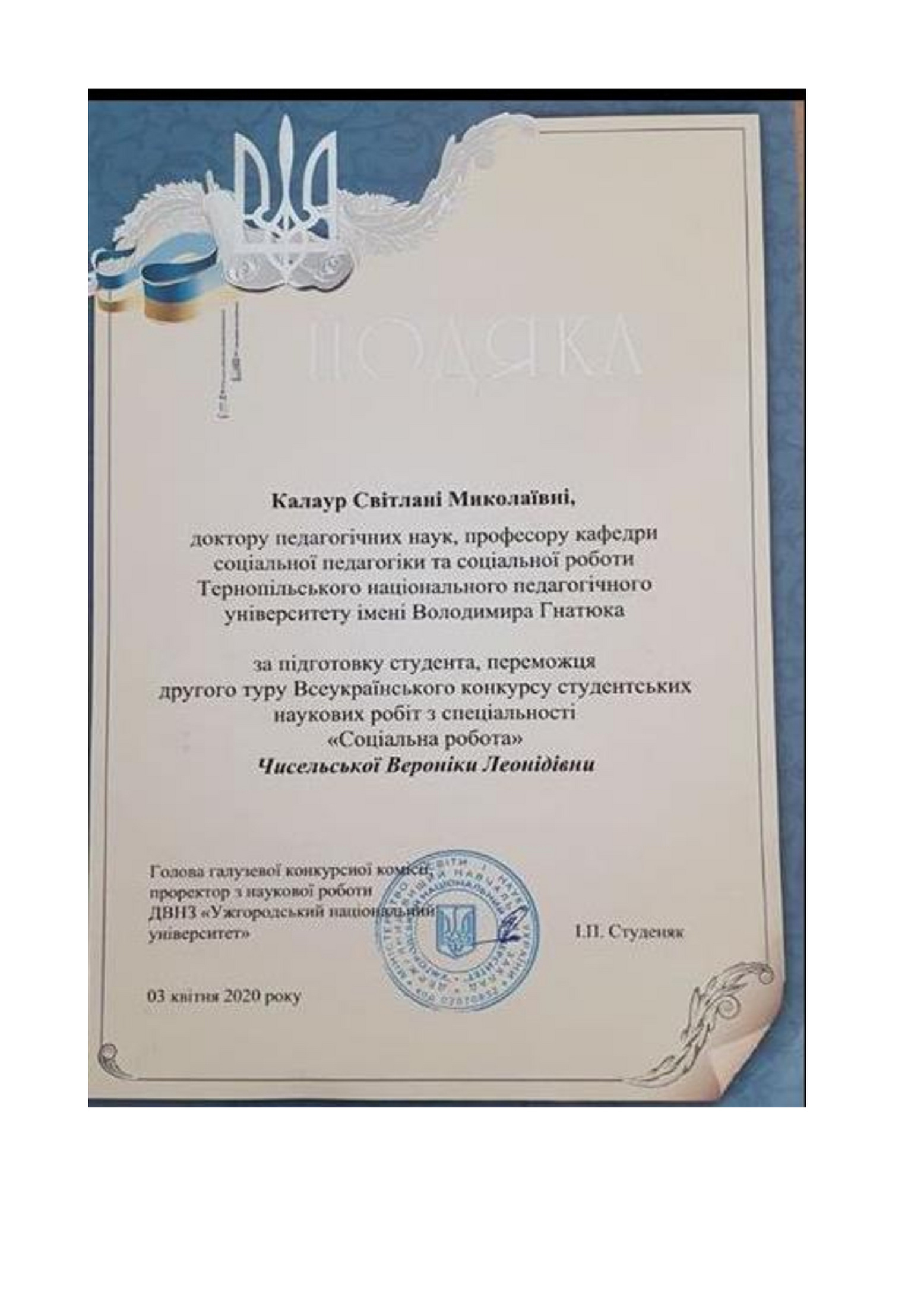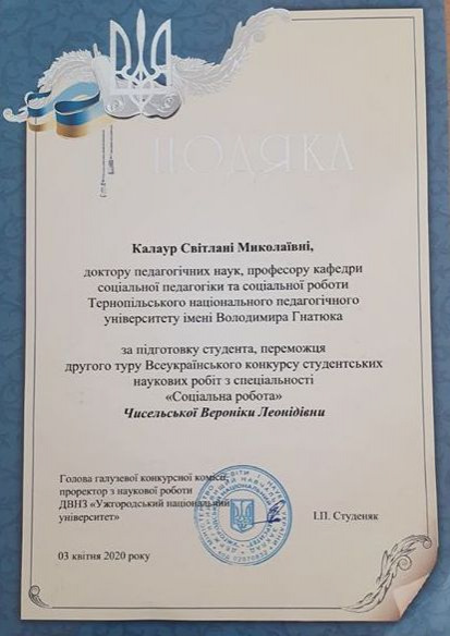 «Система професійної підготовки майбутніх фахівців соціальної сфери до розв’язання конфліктів у професійній діяльності» 13.00.04. – теорія і методика професійної освіти (Дисертація захищена 14 лютого 2019 року Спеціалізована вчена рада Д 58.053.03 Тернопільського національного педагогічного університету імені Володимира Гнатюка м. Тернопіль)