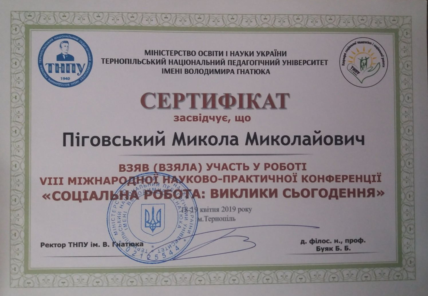 Стажування та сертифікати: учасник VIII Міжнародної науково-практичної конференції “Соціальна робота: виклики сьогодення”, (18-19 квітня 2019 року).